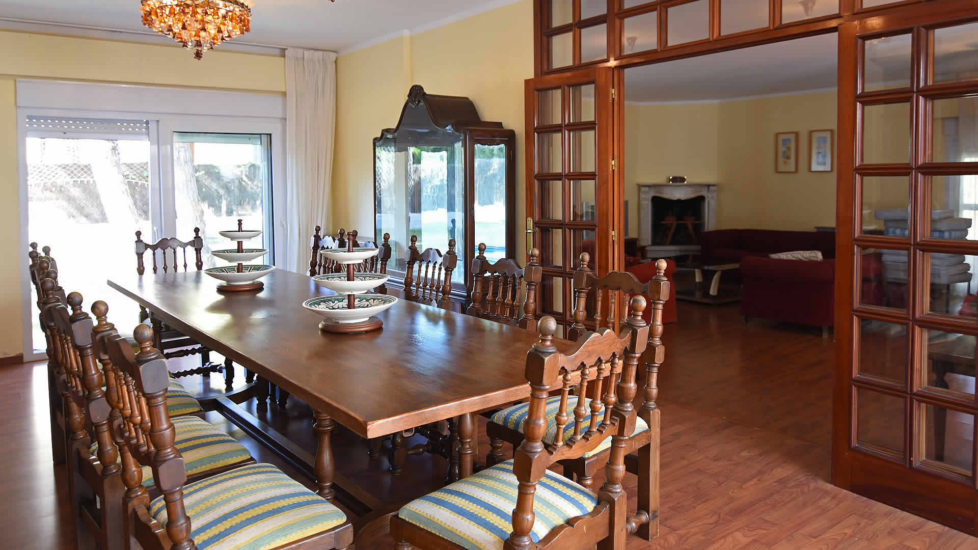 Amueblado con elegancia, esta villa ofrece un ambiente relajado y encantador. Casi todas las habitaciones ocupan la planta baja, con la excepción de un dormitorio y un baño en la primera planta. El salón/comedor y la cocina son muy amplias, la ultima equipada con vitroceramica, horno, frigorífico/congelador, microondas, lavavajillas y lavadora. La casa dispone de 7 dormitorios: 2 con cama de matrimonio (de 1,35m), 1 dormitorio con 4 camas de 90 (2 literas) y 4 dormitorios con 2 camas individuales. Uno de estos dormitorios se accede pasando por otro, es decir uno está dentro del otro. Hay 3 baños en la planta baja y 1 baño en la primera planta.