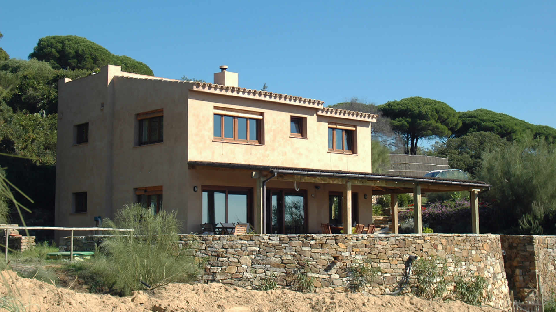 La casa esta amueblada y decorada con buen gusto, ofreciendo un ambiente relajado y un toque de lujo. El salón mezcla ambiente con la cocina, organizada en plan-abierto. Hay televisión por satélite, TV, DVD y Home cinema. La cocina es muy completa con vitro-cerámica, horno, frigorífico/congelador y lavavajillas. También hay lavadora y secadora. El dormitorio principal dispone de cama de matrimonio y baño ensuite. Los otros 2 dormitorios tienen 2 camas individuales cada uno. Hay 2 baños adicionales para uso compartido. Dispone de Internet Wifi (la conexión es vía satélite por lo que no tiene la velocidad de una línea ADSL convencional).