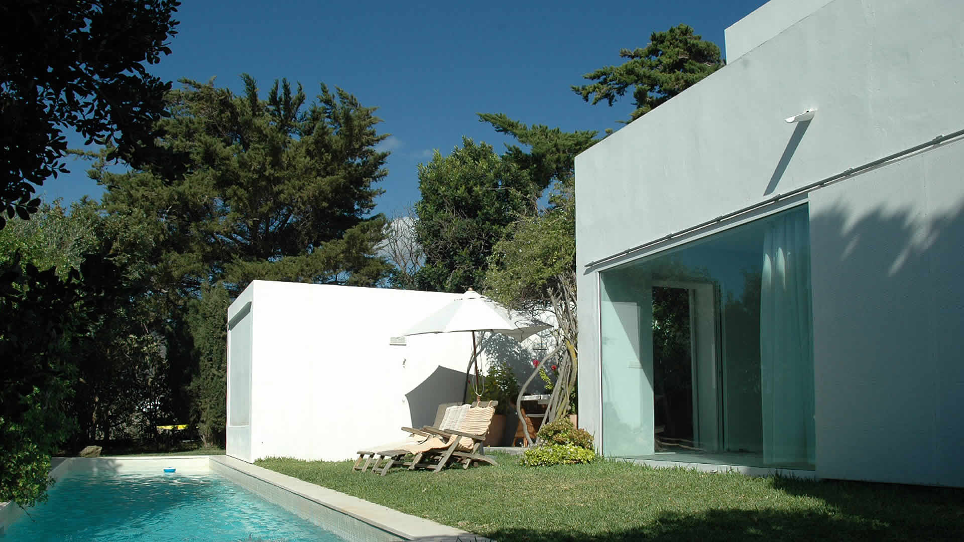 Esta imponente casa cuenta con un moderno interior en colores blancos y todo tipo de comodidades, siendo presentada en varias revistas de interiorismo. La minimalista sala de estar tiene un gran ventanal con vistas al jardÃn y una chimenea para los dÃas más frÃos de la temporada baja. Junto a la sala de estar, encontrará un relajante salón que puede convertirse en un tercer dormitorio. Ãste cuenta con un colchón de gran tamaño (3 X 2 metros aprox.), televisión de pantalla plana, DVD y equipo musical. La cocina-comedor está independiente y completamente equipada con frigorÃfico combi, microondas, lavadora y lavaplatos. La planta baja también presenta un cuarto de baño completo. En el primer piso hallará el dormitorio principal con maravillosas vistas al mar y otro dormitorio con dos camas individuales. Se completa esta planta con un cuarto de baño completo y dos terrazas con vistas.