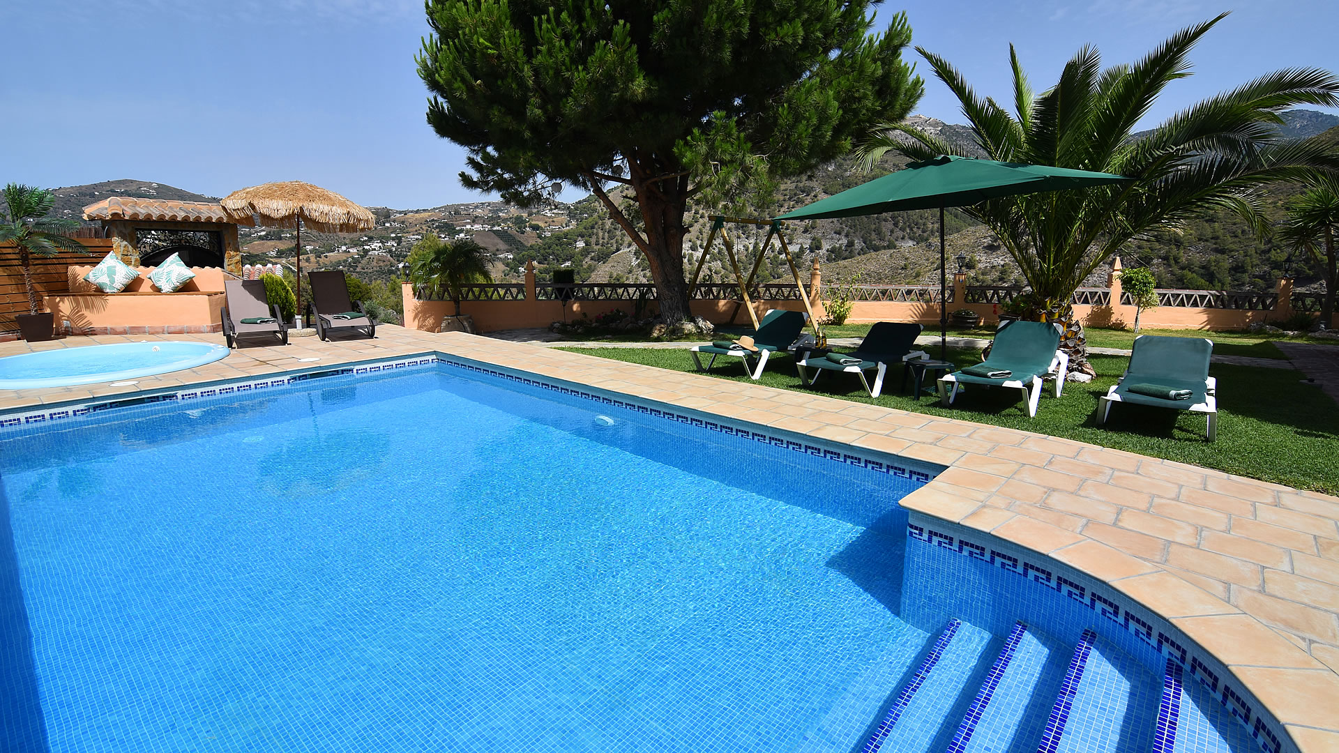 Esta preciosa casa independiente, en la que encontrará todo lo necesario para pasar unas espléndidas vacaciones de verano, se encuentra al final de un camino rural de cemento, a cinco kilómetros al noroeste de Frigiliana. El acceso a la propiedad se hace a través de una entrada privada, situada junto al tranquilo camino rural, y conduce a un jardÃn de césped y a una soleada terraza que rodea la piscina (7m x 4m; 1,20m profundidad). A la derecha podrá disfrutar de una cocina exterior a la sombra que cuenta con fregadero, frigorÃfico, barbacoa, encimera, utensilios de cocina, etc. ¡Perfecta para comidas al aire libre! A la izquierda y al otro lado de la casa encontramos una terraza con pérgola, una mesa de ping pong y más jardÃn privado. La casa está situada en la cima de un cerro, ofreciendo espectaculares vistas hacia Competa, Torrox y el campo andaluz. También es un enclave perfecto si quiere explorar AndalucÃa; los cercanos pueblos blancos o la ruta del vino dulce malagueño. Si prefiere quedarse en casa, disfrute entonces con un vaso de sangrÃa en alguna de las zonas de descanso o leyendo un libro en una tumbona junto a la piscina. El área es un paraÃso para excursionistas. Recomendamos especialmente un paseo hasta la aldea de El Acebuchal (30-40 minutos a pie), que cuenta con una interesante historia. Sus habitantes fueron obligados a abandonarla en 1949 durante el régimen franquista y reconstruida posteriormente en 1998. Si lo que prefiere es pasar un dÃa en el Mediterráneo, puede conducir hasta Nerja ( 15- 20 minutos) donde tendrá un maravilloso abanico de playas donde elegir. La casa también cuenta con un aparcamiento privado al aire libre para dos coches. El acceso por el camino rural es un tanto estrecho aunque no presenta ningún peligro.