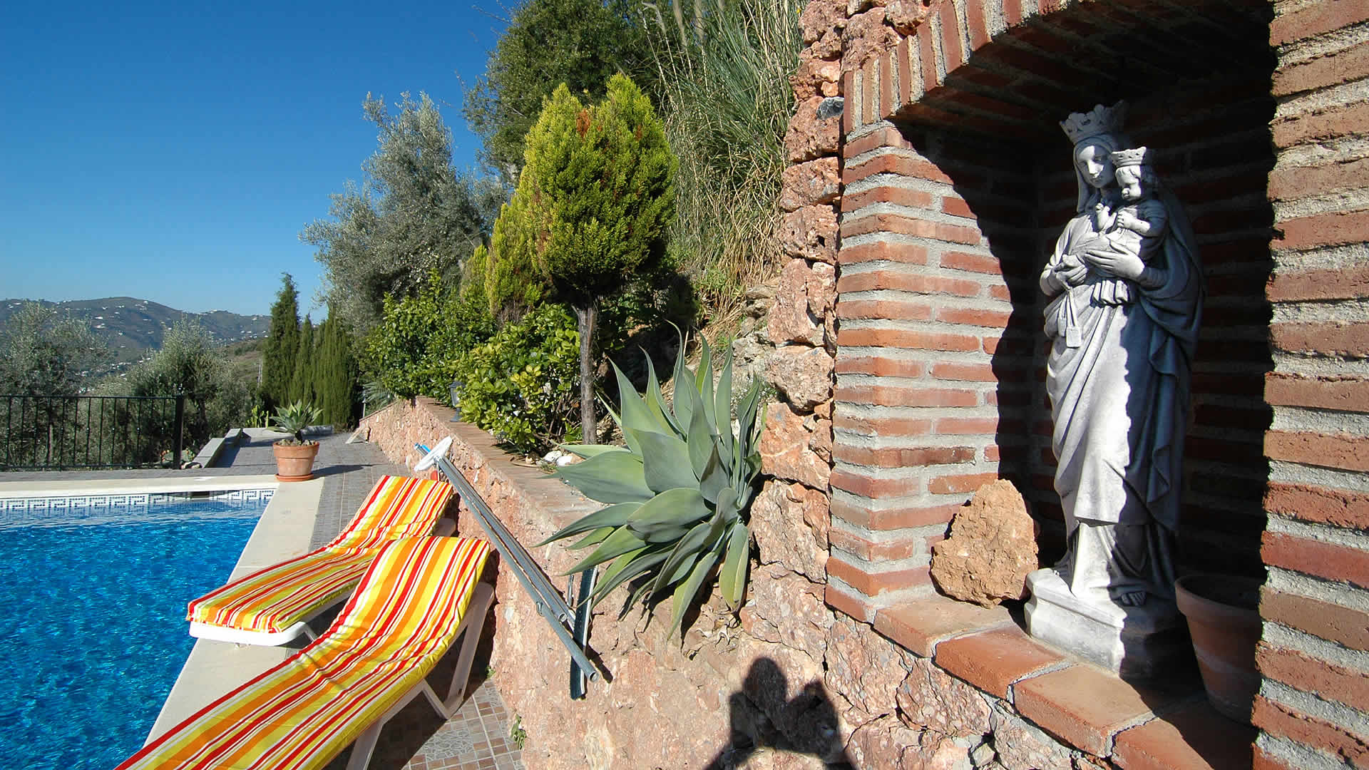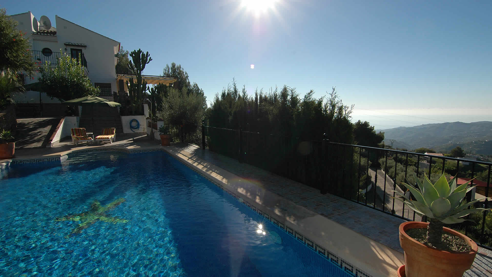 A esta bonita villa independiente se llega a través de un camino de montaña hormigonado, pero se encuentra a menos de 10 minutos en coche de Frigiliana (4 km) y sólo a 20 minutos de la costa de Nerja y sus playas arenosas (11 km). A la llegada, sus ojos directamente captarán las magnÃficas vistas sobre el paisaje de los alrededores hasta el Mediterráneo. Hay varias terrazas espaciosas y zonas de estar, mientras que la piscina está rodeada por un jardÃn lleno de flores, plantas, arbustos y árboles. La piscina privada con escalones romanos está situada en una zona vallada para asegurar la seguridad para niños, y es de buenas dimensiones (10m x 5m y de 1m a 2,5m de profundidad). La zona de barbacoa se acompaña con muebles de jardÃn y es el lugar ideal para entretener a sus invitados una tarde noche mientras disfrutan de una fresca sangrÃa bajo el cielo estrellado. Una ducha exterior de piscina está convenientemente situada en dicha terraza.