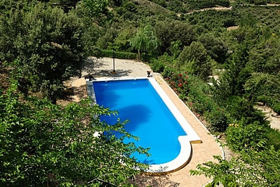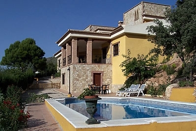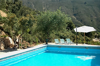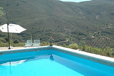 Estas 2 encantadoras villas (ver también ref Jaén 002 y Jaén 003) están situadas en plena comarca de Sierra Sur en un paisaje algo dramático de preciosas montañas verdes. Las villas son completamente independientes y construidas en 2 niveles. Cada villa tiene su piscina privada y amplias zonas de su uso exclusivo en el exterior. Tan sólo les une una escalera que puede ser cerradas desde ambos lados. La villa en el nivel inferior tiene una preciosa terraza junto al salón donde da gusta cenar con las impresionantes vistas sobre el paisaje. La atractiva piscina privada esta situada en un nivel inferior y dispone de vistas panorámicas, hamacas y sombrilla. La villa situada en el nivel superior tiene un rincón con muy agradable con muebles de jardÃn entre los árboles para las comidas en el exterior. Las vistas al paisaje desde la tentadora piscina son inmejorables e invitan a relajarse con un buen libro en una de sus hamacas. No muy lejos de las villas hay un restaurante-asador donde se puede ir andando. El acceso a las casas es asfaltado y cada villa dispone de una zona de aparcamiento.