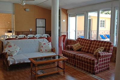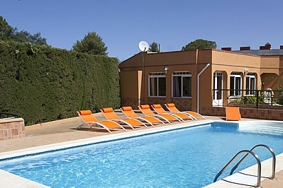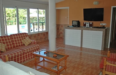 La vivienda tiene las estancias dividas entre dos plantas y esta decorado con gusto por sus propietarios. A la planta baja se accede a través de una entrada que comunica con un salón/ comedor muy acogedor, equipado con 2 sofás, televisión, DVD y aire acondicionado. Una terraza cerrada con vistas a la piscina se ha convertido en un espacio segundo salón, también con sofás, televisión, mesa comedor. La cocina comunica con el segundo salón y esta muy bien equipada con lavavajillas, microondas, horno eléctrico, placa vitro-cerámica y frigorÃfico/congelador. En esta planta encontramos 5 dormitorios dobles. El 6º dormitorio tiene espacio para 4 personas: hay 2 camas individuales y una cama litera empotrada para 2 personas más. Hay 2 baños completos (con bañera o con ducha). El acceso a la segunda planta es independiente: hay dos dormitorios, uno de ellos con cuatro literas y el otro con dos camas. Baño completo. Aire acondicionado en los dos dormitorios. Gran solarium. Nota: Dispone de conexión a Internet WiFi (sin coste adicional).