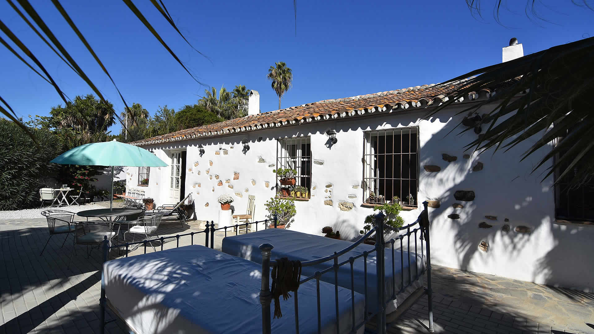Se accede al cortijo a través de una terraza que se encuentra delante de la casa. En el patio interior se encuentra la piscina privada (6m x 4m), como un secreto bien-guardado. Desde aquÃ, antiguas puertas de madera abren hacia una sombreada terraza 'chill-out' con 2 camas antiguas al aire libre. Hay barbacoa y mobiliario de jardÃn para disfrutar las comidas al aire libre. El mar esta a tan sólo 300 metros, una distancia que ofrece la posibilidad de ir de paseo por la playa hasta llegar a Nerja, en menos de 15 minutos. Aquéllos que quieren enriquecer su conocimiento cultural pueden visitar el Museo Picasso en Malaga, el Alhambra en Granada o uno de los muchos lugares interesantes en Andalucia. Nota: para ir a la playa hay que cruzar la N340, por lo que será necesario acompañar a los niños.