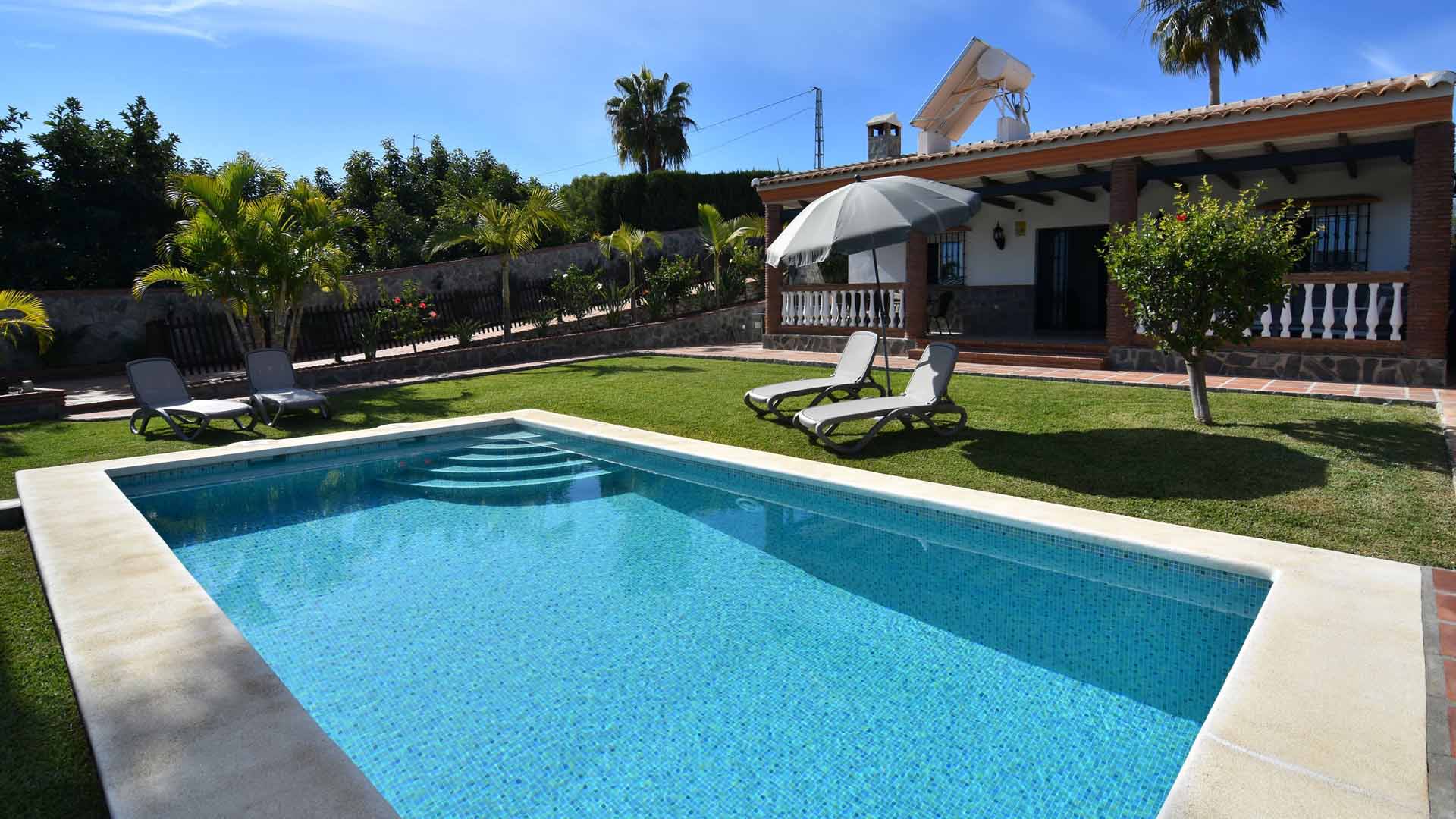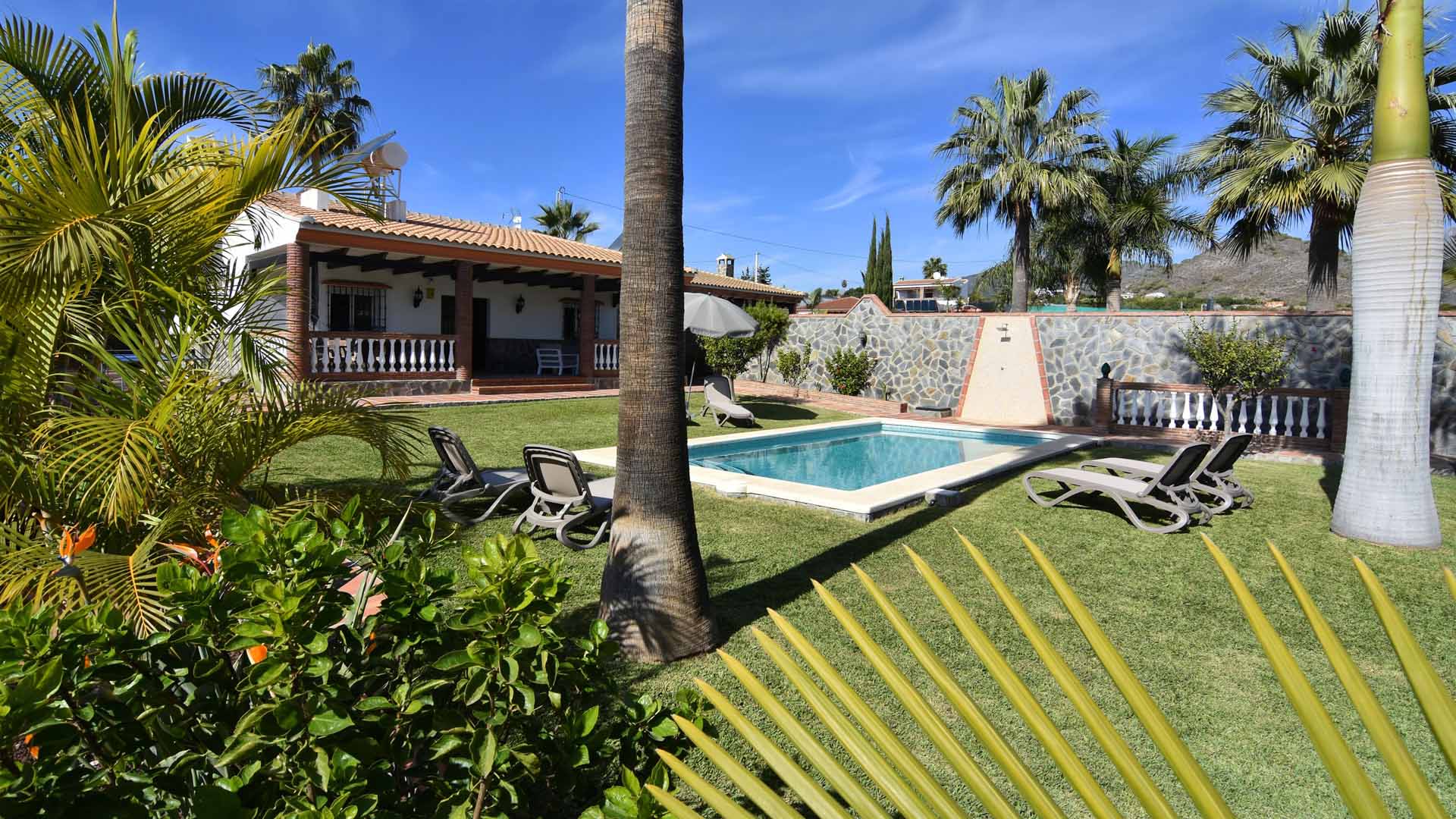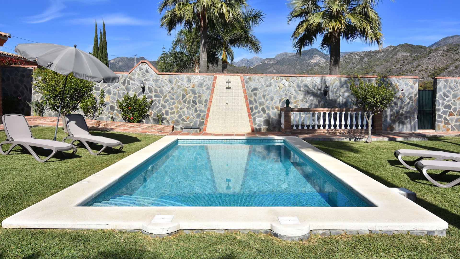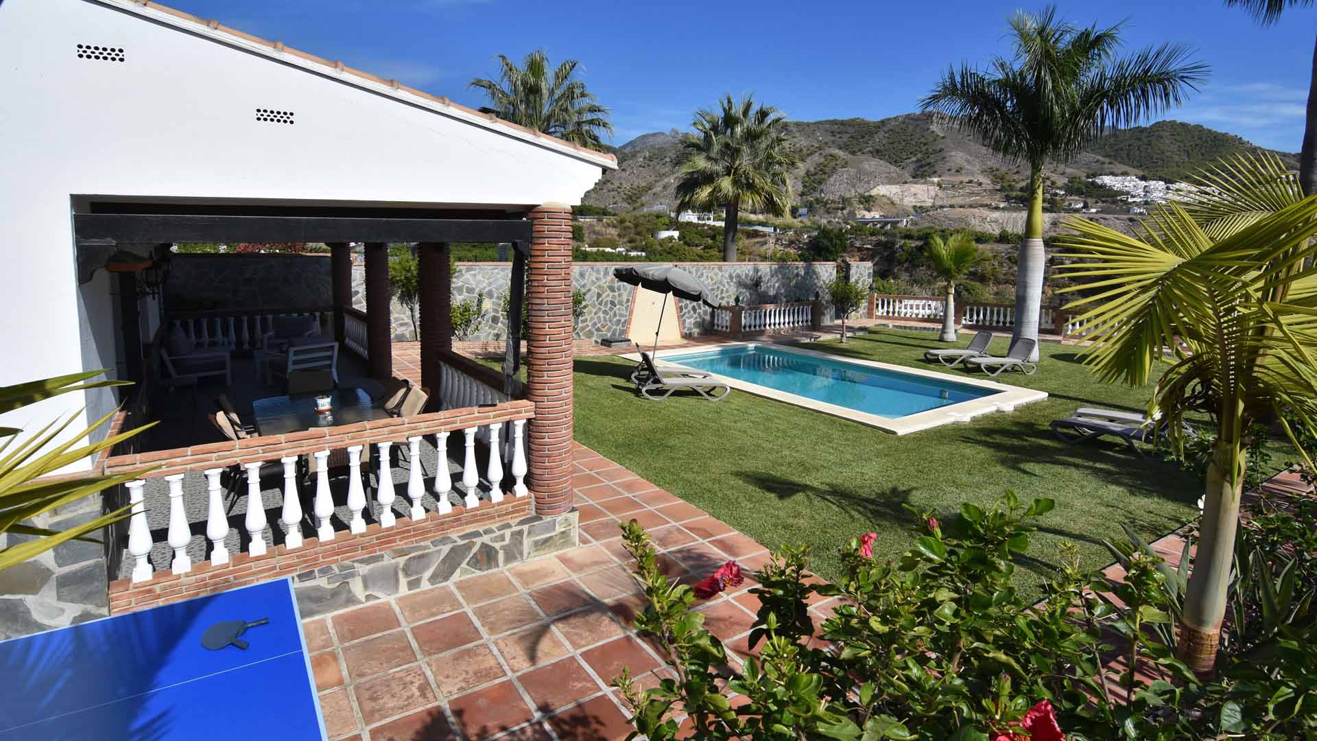De villa is bereikbaar via een eigen weg vanaf de elektronisch bediende toegangspoort. U kunt buiten eten op het mooie, schaduwrijke terras dat aan het huis grenst, een barbecue staat voor u klaar! Zonaanbidders zullen gecharmeerd zijn van het gazon dat het verleidelijke privé zwembad van 8 x 4 meter omringt, compleet met ligstoelen. Vanaf hier hebt u een schitterend uitzicht, óver de toppen van de avocadobomen, over het landschap en de heuvels die Nerja omringen. De villa ligt slechts 5 minuten rijden van Nerja (3 kilometer) en het Burriana strand is nog dichterbij (2,2, kilometer). Historisch Granada, met zijn spectaculaire Alhambra paleis, het Middeleeuwse AlbaicÃn district, winkels, zijn mooie pleinen en paleizen is een bezoek meer dan waard, iets meer dan een uur rijden. De omgeving van het huis is een paradijs voor wandelaars; in de plaatselijke boekwinkels kunt u het boekje "Twelve walks around Nerja", geschreven door Elma en Denis Thompson, kopen. Enkele andere excursies die u kunt maken zijn de schilderachtige "witte" dorpen van de Axarquia en de historische Nerja grotten.