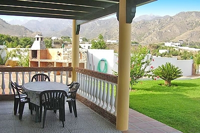 Se accede a la propiedad a través de una entrada privada que baja desde la valla automático con mando a distancia. Para las comidas en el exterior encontrará un sombreado porche - hay barbacoa. Los amantes del sol estarán encantados con la amplia zona de césped que rodea la piscina (8x4m). Hay 6 hamacas para que todo el mundo puede broncearse cómodamente. Tanto desde el porche como desde el jardÃn disfrutará de estupendas vistas panorámicas sobre campos de aguacates, con la Sierra de Almijara en el norte y Nerja al sur y el mar al fondo. La casa se encuentra a tan sólo 5 minutos en coche (2 kms) de Nerja y de playa Burriana (2,2 kms).