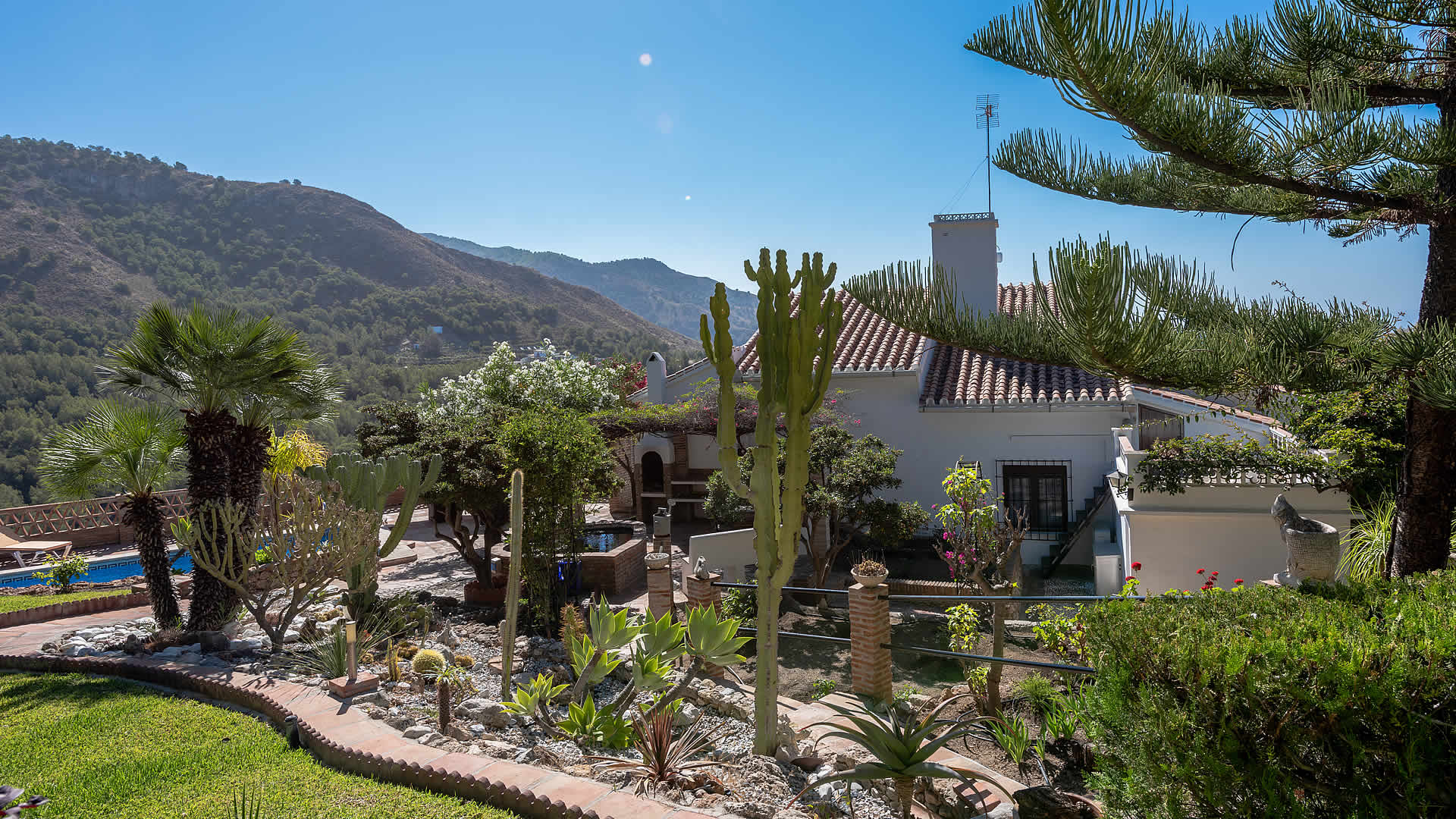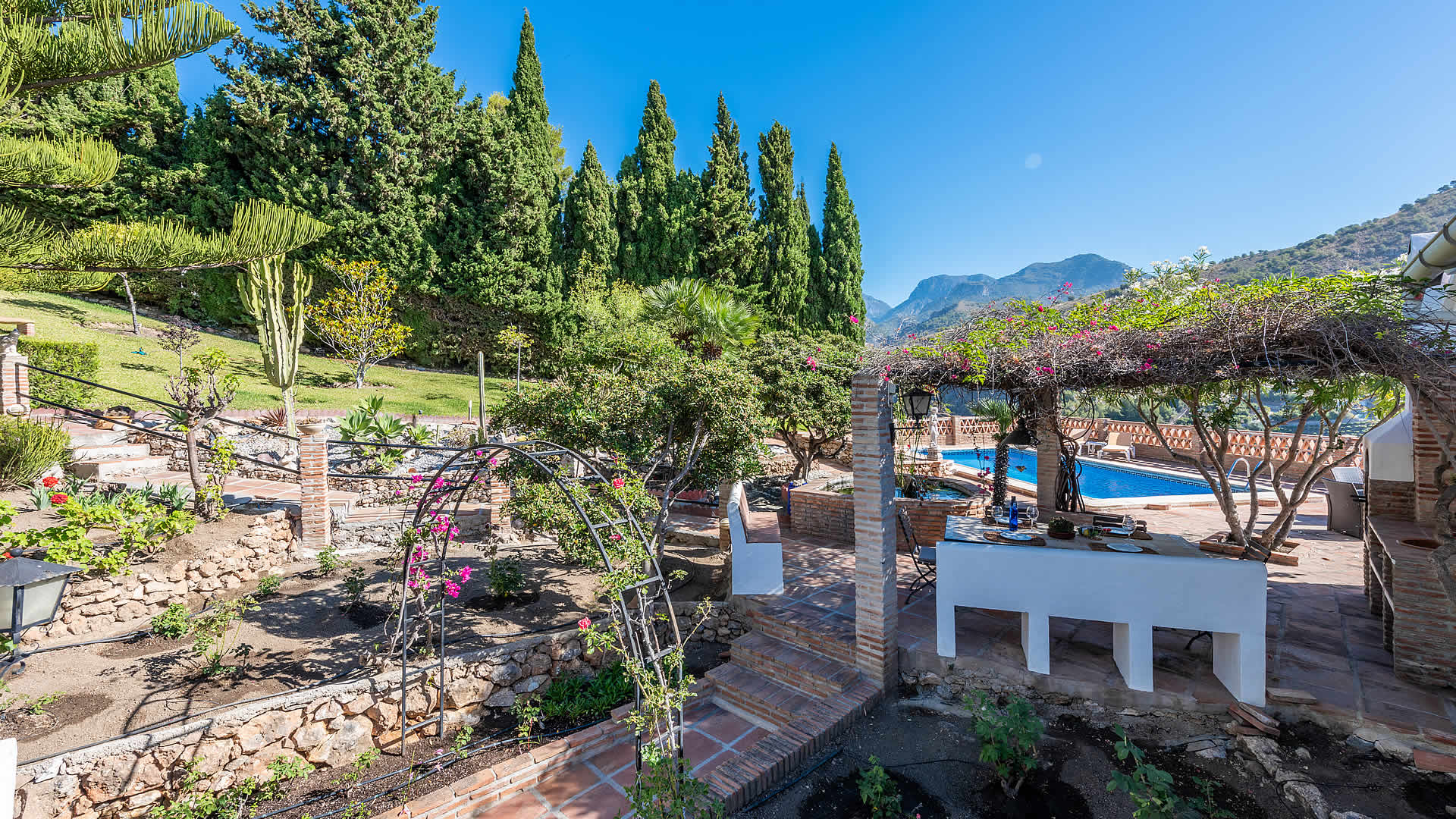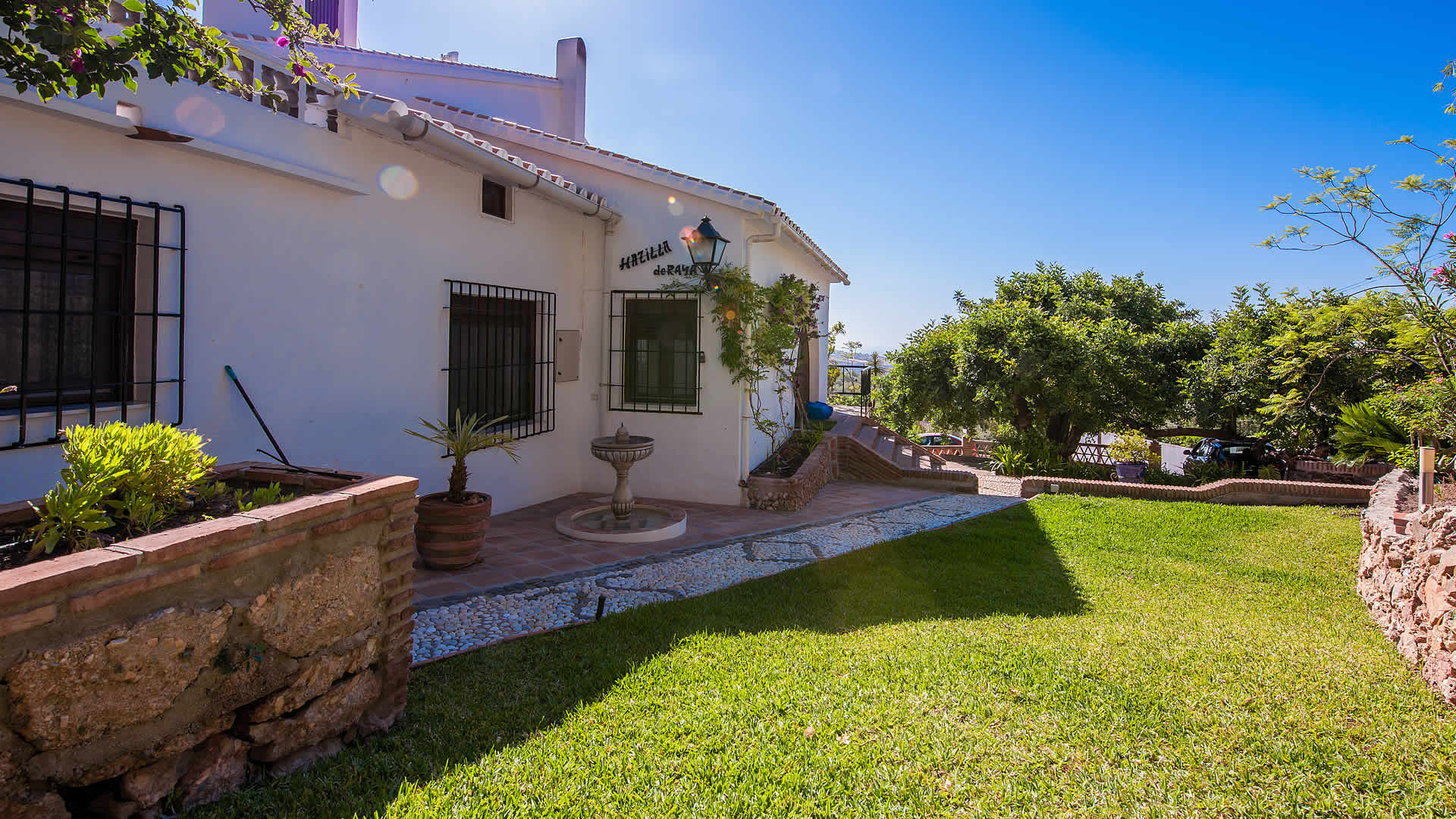 En 1963, un caballero alemán y una dama francesa cayeron perdidamente enamorados. Con el fin de compartir sus destinos, ambos tendrÃan que renunciar en vida a un sin fin de cosas importantes. Tanto el Sr. Neukirch como la Sra. Driou estaban entusiasmados con la zona de Nerja y Frigiliana y decidieron construir una casa de ensueño con vistas al mar y a la montaña. En su búsqueda por la mejor localización, subieron por la carretera de montaña en dirección a Frigiliana, por aquel entonces sin asfaltar y por la que mayormente circulaban mulas y caballos. Revisaron los terrenos palmo a palmo y fue entonces cuando divisaron el algarrobo. Tomaron la decisión en el acto. Cuando se construyó la casa en 1965, se convirtió en la primera en hallarse en la zona más oriental de la carretera. La casa fue vendida a sus actuales propietarios, Javier y Rosario, en febrero de 1992. Javier y Rosario la renovaron y remodelaron sin modificar su estilo tan personal.En 1993 decidieron darle otro aire al gran jardÃn y hacerlo más accesible, de manera que su espléndido carácter pudiese ser enteramente disfrutado por los futuros huéspedes. Se añadieron algunos escalones para poder acceder a los diferentes niveles con los que cuenta el jardÃn y donde también hay una extensa pradera de césped con abundancia de plantas y flores autóctonas de la zona de la AxarquÃa de Málaga y provincia. En la parte trasera de la casa, una pérgola con barbacoa se convierte en la zona nocturna favorita de los huéspedes. En la espaciosa área de piscina encontramos una gran piscina (9 x 4m y 1.4 -1.8m de profundidad) totalmente privada y que disfruta de una maravillosa panorámica del mar hacia el sur y de las impresionantes vistas de Frigiliana y el Parque Natural de la Almijara hacia el norte. También se ha introducido en el jardÃn un pequeño estanque elevado con carpas y plantas acuáticas que está en perfecta armonÃa con la paz y quietud de tan excepcional enclave.