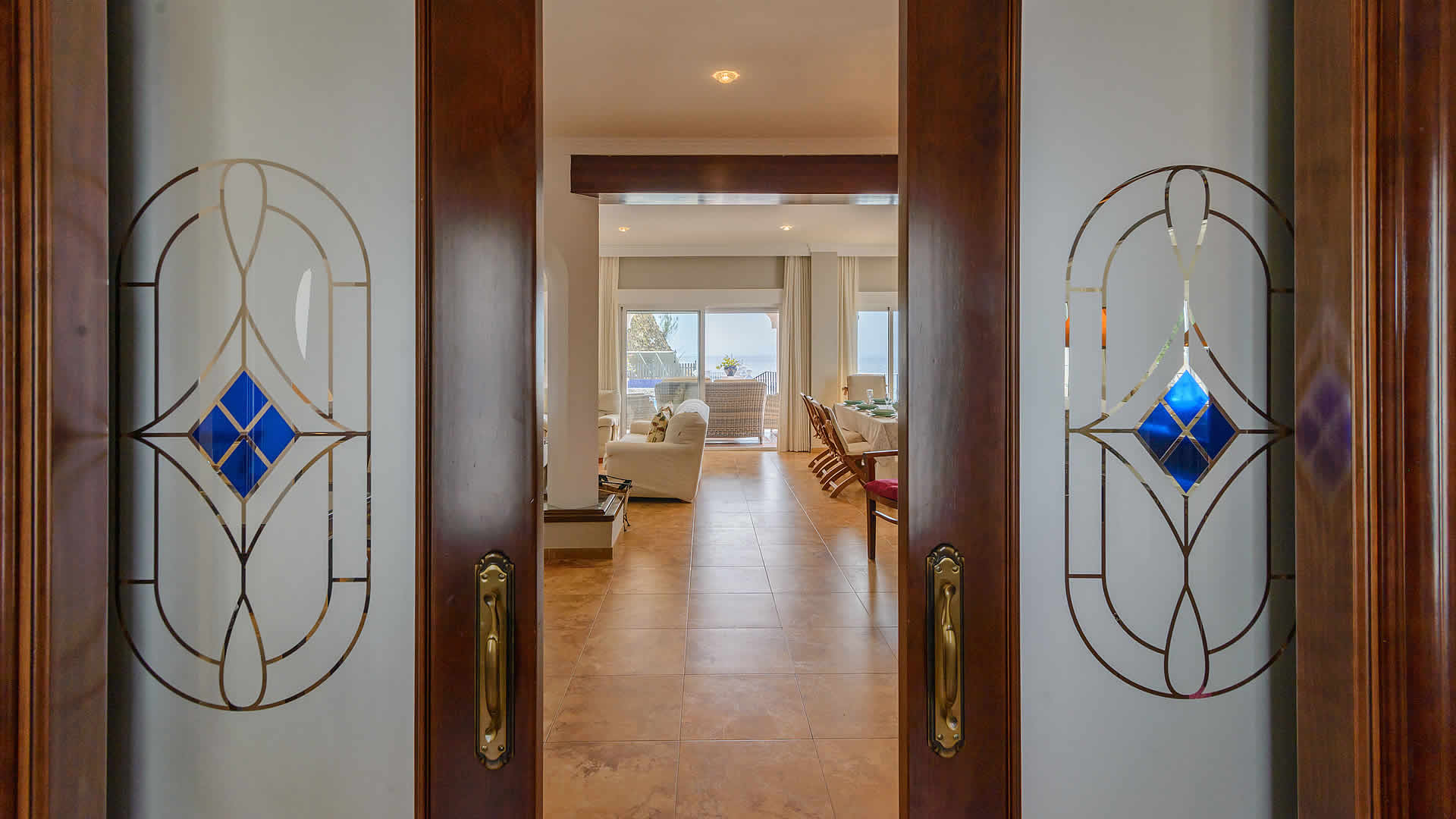 In den elegant und komfortabel eingerichteten Räumen erkennt man sofort das hohe Niveau dieser Villa, in der Ihr Urlaub eine hellen Freude sein wird. Sie hat Erdgeschoss und zwei Etagen.ERDGESCHOSSVon der ersten Etage führt eine Treppe hinunter in das Erdgeschoss, das zwei Schlafzimmer beherbergt â eines mit zwei Einzelbetten, das andere mit Doppelbett. Diese haben einen wunderschönen Blick auf das Meer, direkten Zugang zur Terrasse und teilen sich eine Dusche mit WC und Waschbecken.ERSTE ETAGEIn der auf StraÃenhöhe gelegenen ersten Etage befindet sich die Eingangshalle, die in einen geräumigen offenen Wohn-/Essbereich im Zentrum der Villa führt. Dieser gemütliche von natürlichem Licht durchflutete Raum ist mit bequemen Sofas, einem Esstisch für acht Personen, einem geschlossenen Kamin, einem Flachbild-Fernseher mit Satellitenempfang, einem DVD-Player und WiFi-Internet ausgestattet. Hinzu kommt eine Essecke, wo die Kinder sich mit Brettspielen vergnügen oder Sie sich mit Freunden unterhalten können.Links von der Eingangshalle befindet sich eine komplett ausgestattete Küche. Sie hat ein 4-Ring-Ceramfeld, einen zweitürigen Kühlschrank mit Gefrierfach, einen Backofen, Mikrowelle, Geschirrspüler und Waschmaschine.Auf der rechten Seite der Eingangshalle ist ein Schlafzimmer mit Doppelbett, wundervollem Meerblick, direktem Zugang zum AuÃenbereich und einer Toilette mit Waschbecken.ZWEITE ETAGEAuf der zweiten Etage befindet sich das Hauptschlafzimmer mit Doppelbett, TV, begehbarem Schrank und komplettem Badezimmer. Es hat zudem eine eigene Terrasse für romantische Abende unter dem Sternenhimmel.Bitte beobachten Sie: Das Haus verfügt über eine WIFI-Internetverbindung, die ohne Mehrkosten genutzt werden kann.