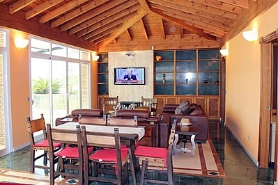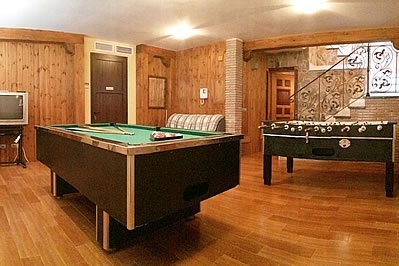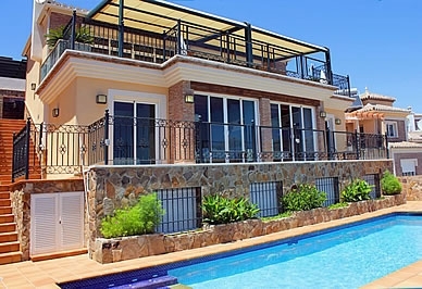 La villa entera fue construida con materiales de alta calidad: techos de madera y suelos de mármol. PLANTA BAJA SUPERIOR La planta baja superior consta de un amplio salón / comedor con grandes ventanales panorámicos que se abren a la terraza. Hay dos sofás, una mesa de comedor para 6 personas, TV vÃa satélite y reproductor de DVD. La cocina está equipada con vitrocerámica de 4 fuegos, nevera / congelador con dos puertas, microondas, horno y lavavajillas. También hay un cuarto de ducha con WC en esta planta. PLANTA BAJA INFERIOR Una escalera conduce del salón al piso inferior que consta de 2 dormitorios con cama de matrimonio y 1 dormitorio con dos camas individuales. Dos de estos dormitorios disponen de baño completo en suite y el tercero tiene un cuarto de ducha con WC. Todos los dormitorios tienen acceso directo a la terraza. PLANTA SÃTANO El sótano es el espacio perfecto para el entretenimiento, equipado con mesa de billar, futbolÃn y televisión. PLANTA DEL JARDIN La planta del jardÃn dispone de un aseo para los invitados y de un cuarto con lavadora y secadora.