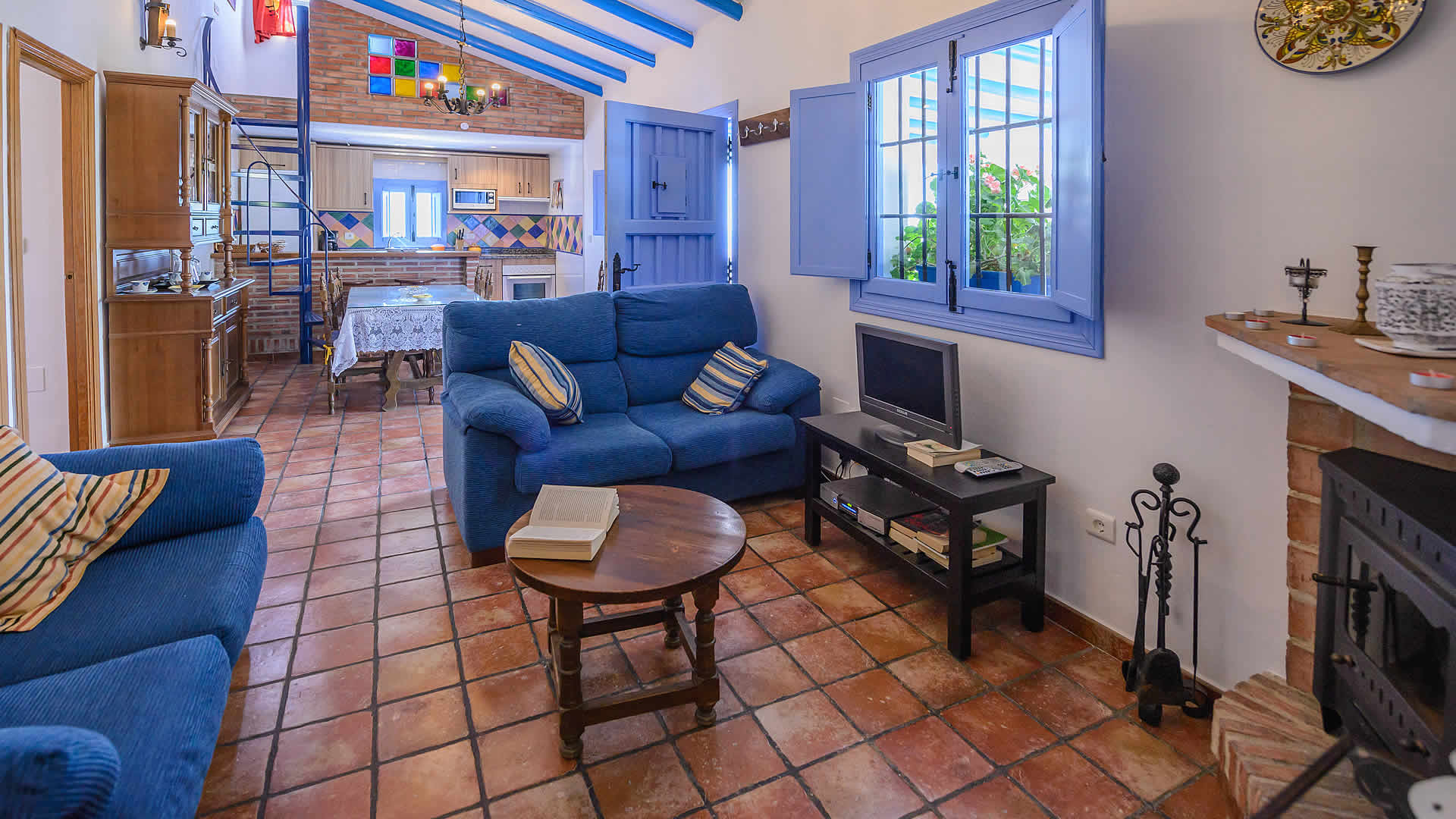 El salón es muy confortable y tiene acceso directo al porche. No es muy grande, pero es amueblado con inteligencia. Hay una mesa comedor, 2 sofás, chimenea y tv por satélite. La cocina esta equipada con vitro-cerámica, horno, lavadora, microondas, lavavajillas y frigorÃfico. En esta planta encontrará 2 dormitorios (uno con cama de 150 cm y otro con 2 camas individuales) y un baño completo. Un tercer dormitorio con cama de 135 cm y baño propio con ducha se encuentra en un apartamento independiente la planta inferior. Internet WiFi disponible (gratuito).Nota: Dispone de aire acondicionado en los dormitorios; es opcional, el coste varÃa en función del uso (a pagar allà a la salida).