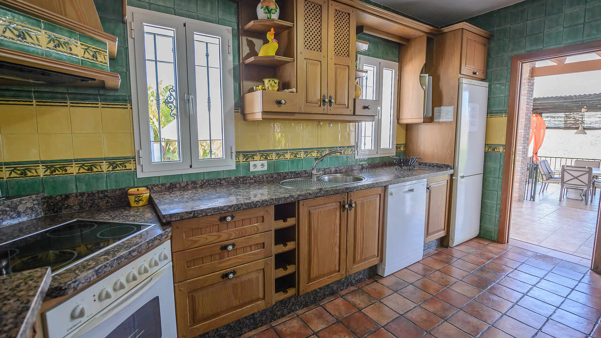 With all rooms all rooms set on the ground floor, this is a very well furnished villa. The spacious living/dining room is decorated with good taste in Andalucian country style and comes with an open fireplace, satellite TV and DVD player. The kitchen is very well equipped with a ceramic hob, dishwasher, microwave, oven, fridge/freezer and a washing machine. The bedrooms consist of three twins and a double bedroom. There is a full bathroom and a shower room with wc and wash basin. A WiFi internet connection is available (free of charge).