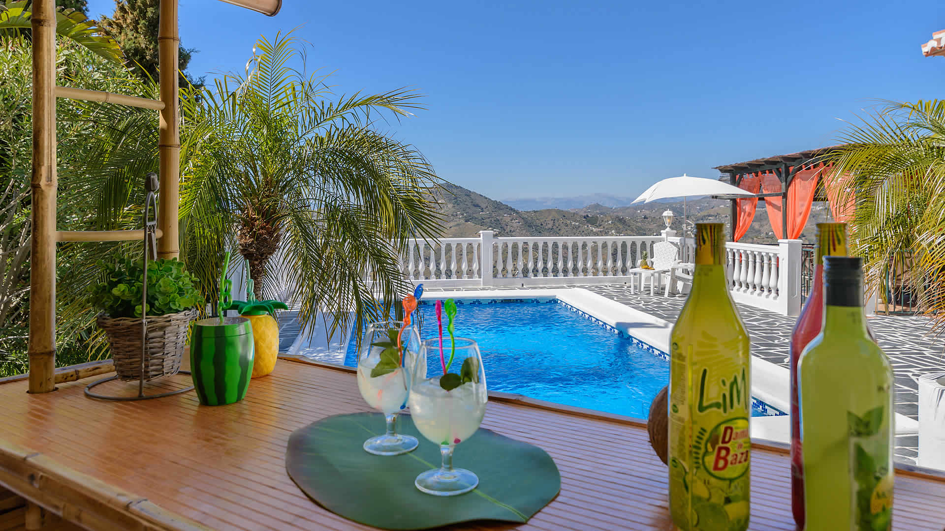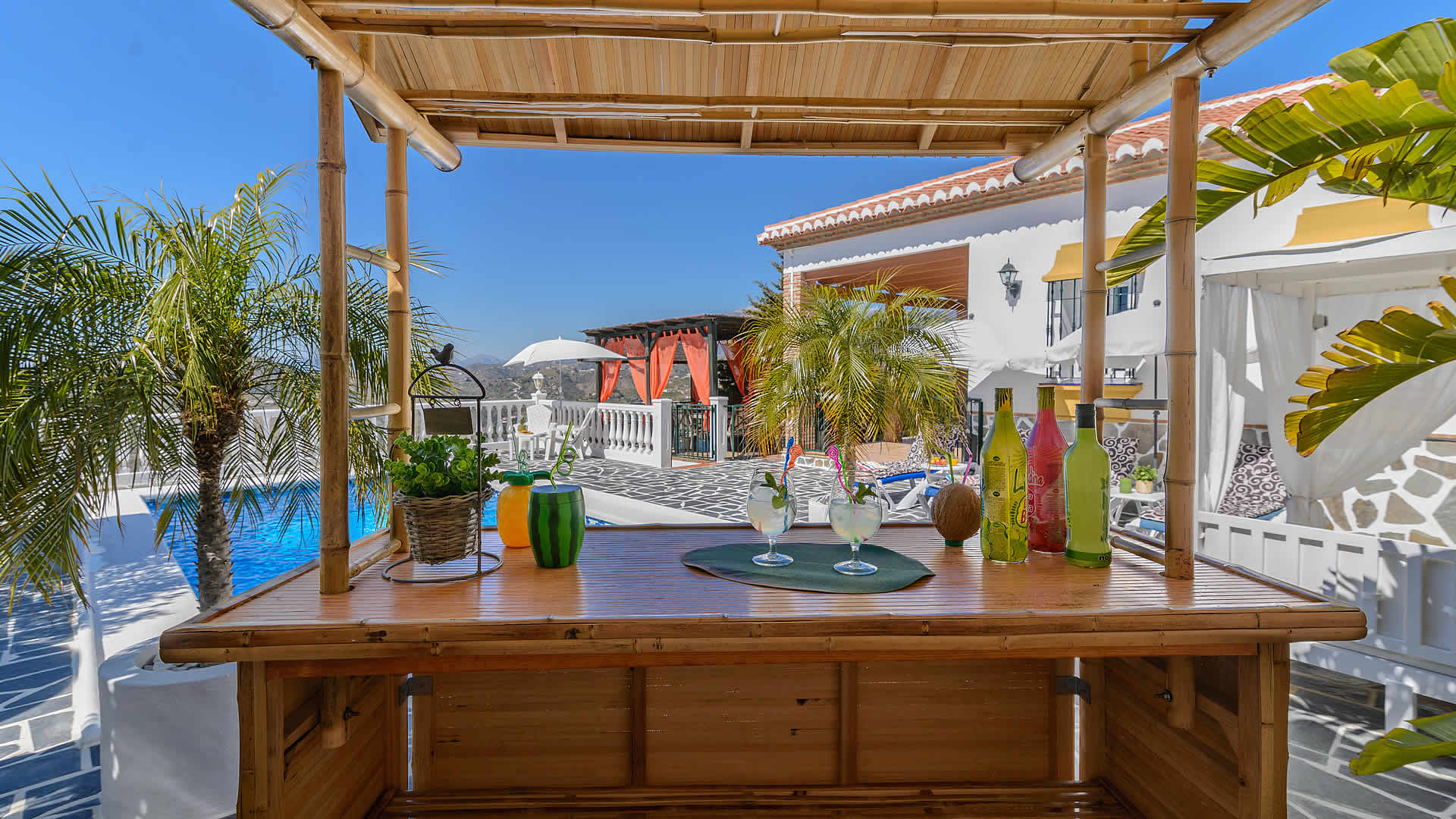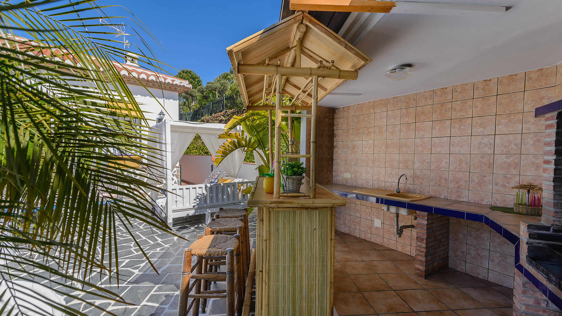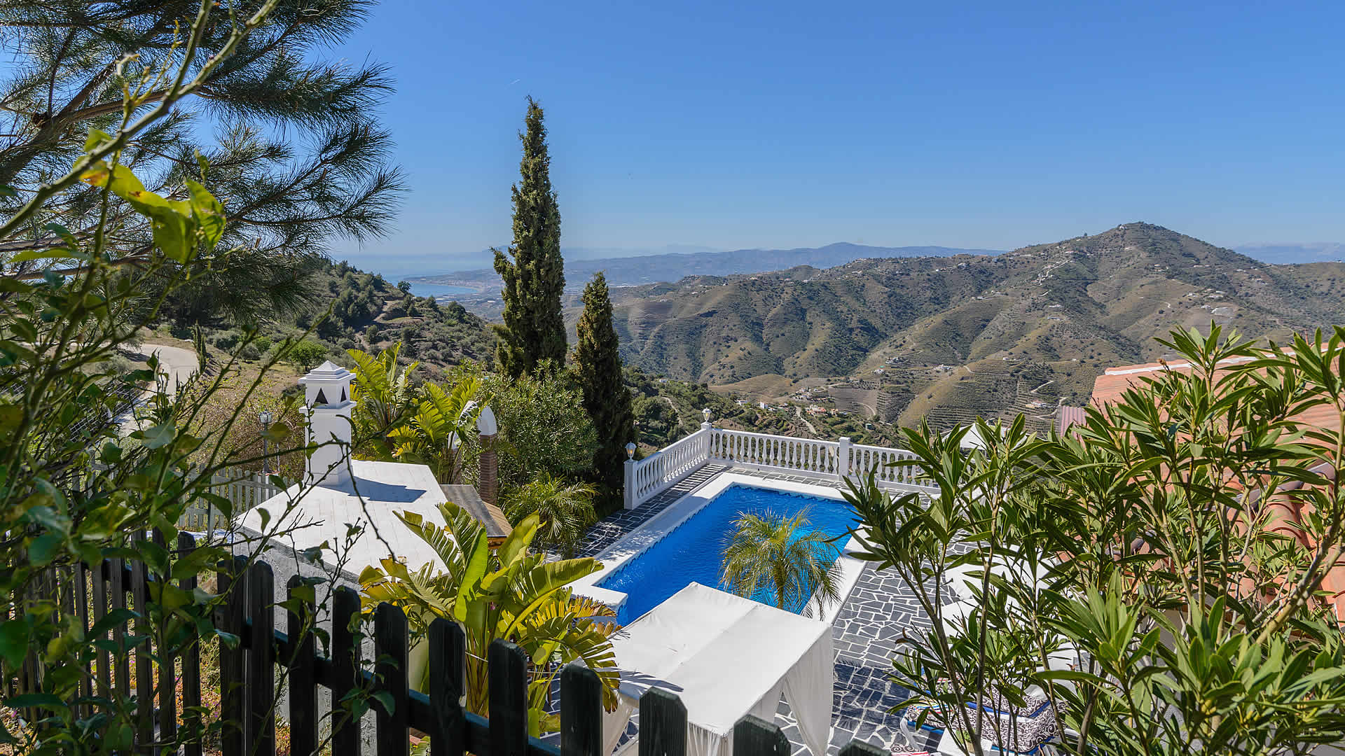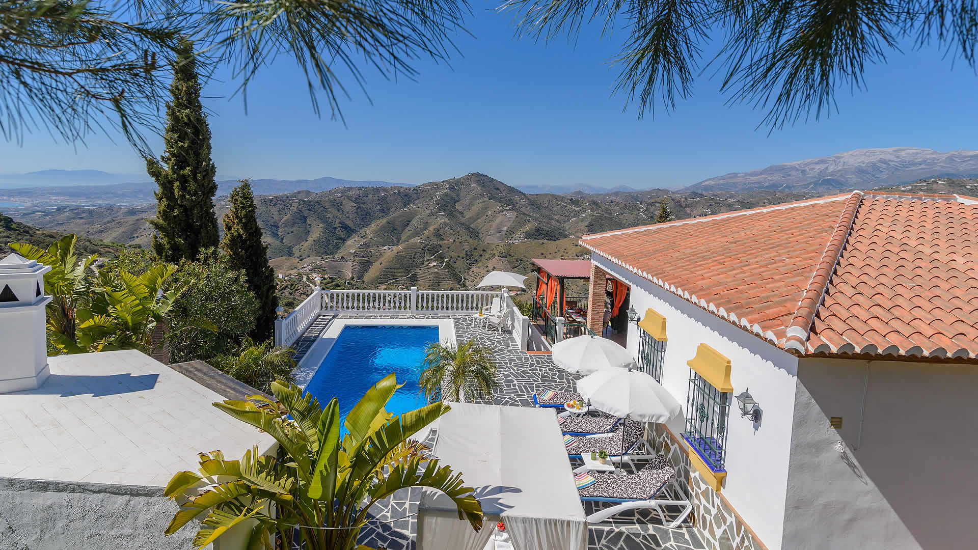 Outside, a covered terrace overlooks your private pool (8x4m) - imagine the magnificent views while dining alfresco at your verandah! At the sun terrace you will find patio furniture, sun loungers and a built-in barbecue. The location of the villa is rural, yet only fifteen minutes drive from the beaches of Torrox Costa (10 km). The villa is accessed by a 1,5 km concreted track and located at 6,5 km from Torrox and 9 km from Cómpeta, a typical white village famous for its' sweet Moscatel wine. It's worth to make a trip into the mountains to see more of these hillside villages of the Axarquia or travel along the coast road towards Almería enjoying splendid views from beautiful coves with hidden beaches.