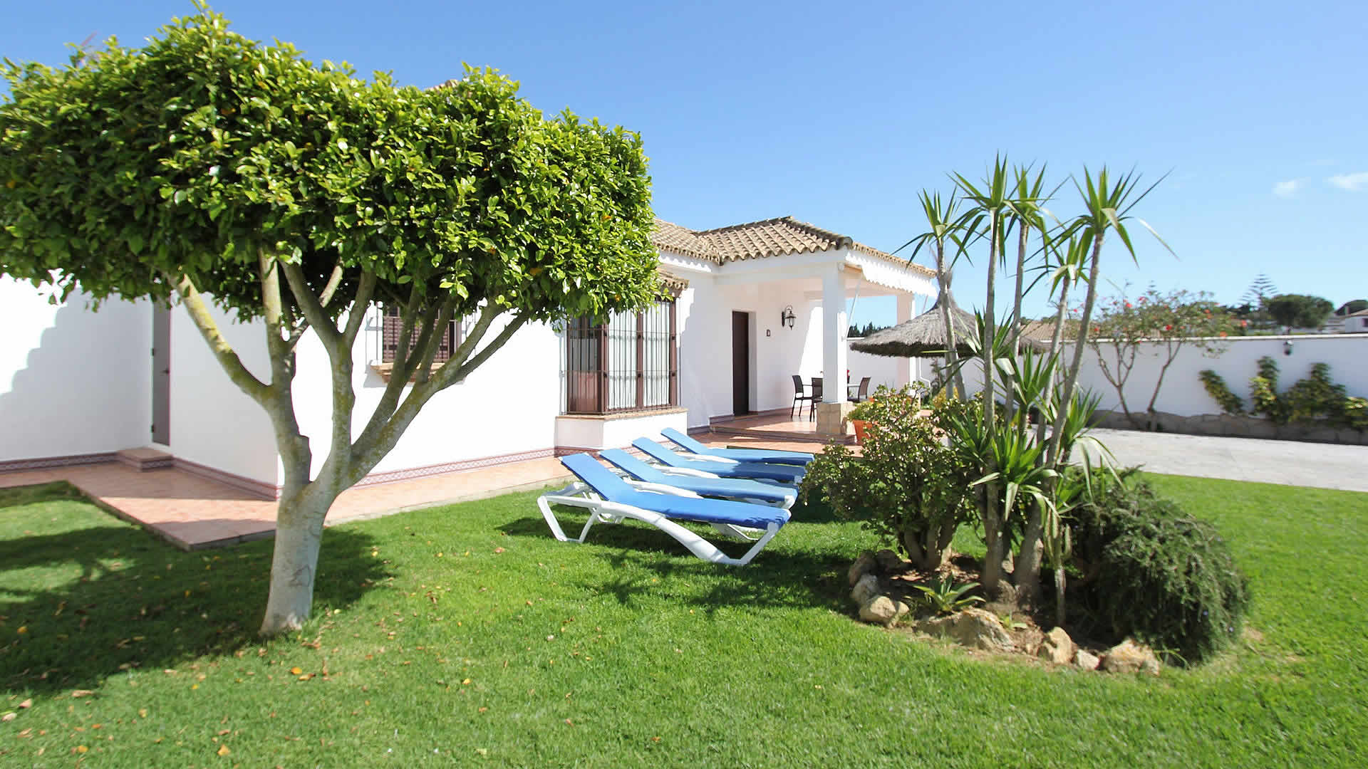 La villa esta situada en Dehesa de la Villa, una zona semi-rural al noreste del centro de Conil (2,5 kms). Es una zona de pequeños huertos donde muchos habitantes de la provincia han construido su casa de vacaciones. Es una zona tranquila sin edificios altos y con fácil acceso; en coche se llega en 5 minutos al centro. El jardÃn de la casa está completamente vallada y tiene un parking para 2-3 coches dentro de la finca. La piscina es privada y se puede cerrar el acceso para la seguridad de los más pequeños. Es bueno saber que la piscina no tiene cloro; esta equipado con un sistema de ionización (agua salada), mucho mejor para la piel y el medio ambiente! Junto a la entrada de la casa hay una zona de césped, completo con tumbonas y barbacoa. Hay un sombreado porche con muebles de jardÃn para disfrutar las comidas en el exterior.