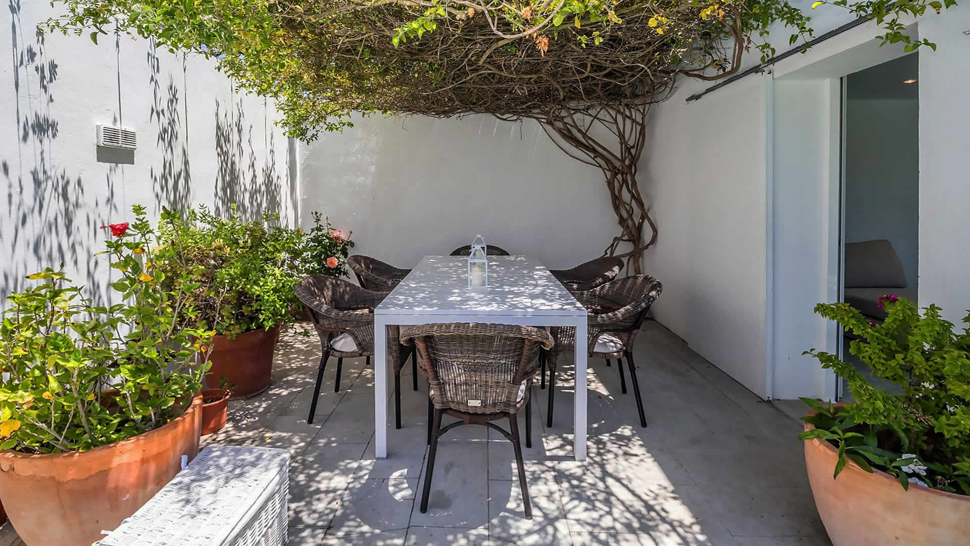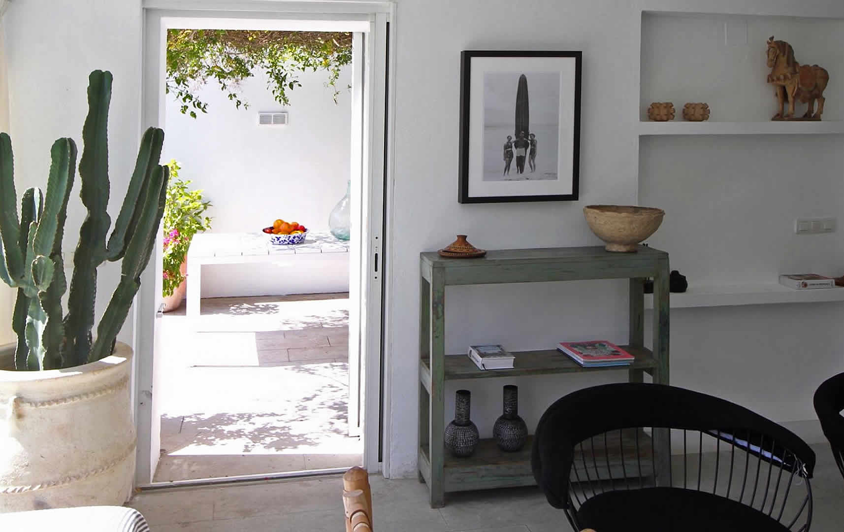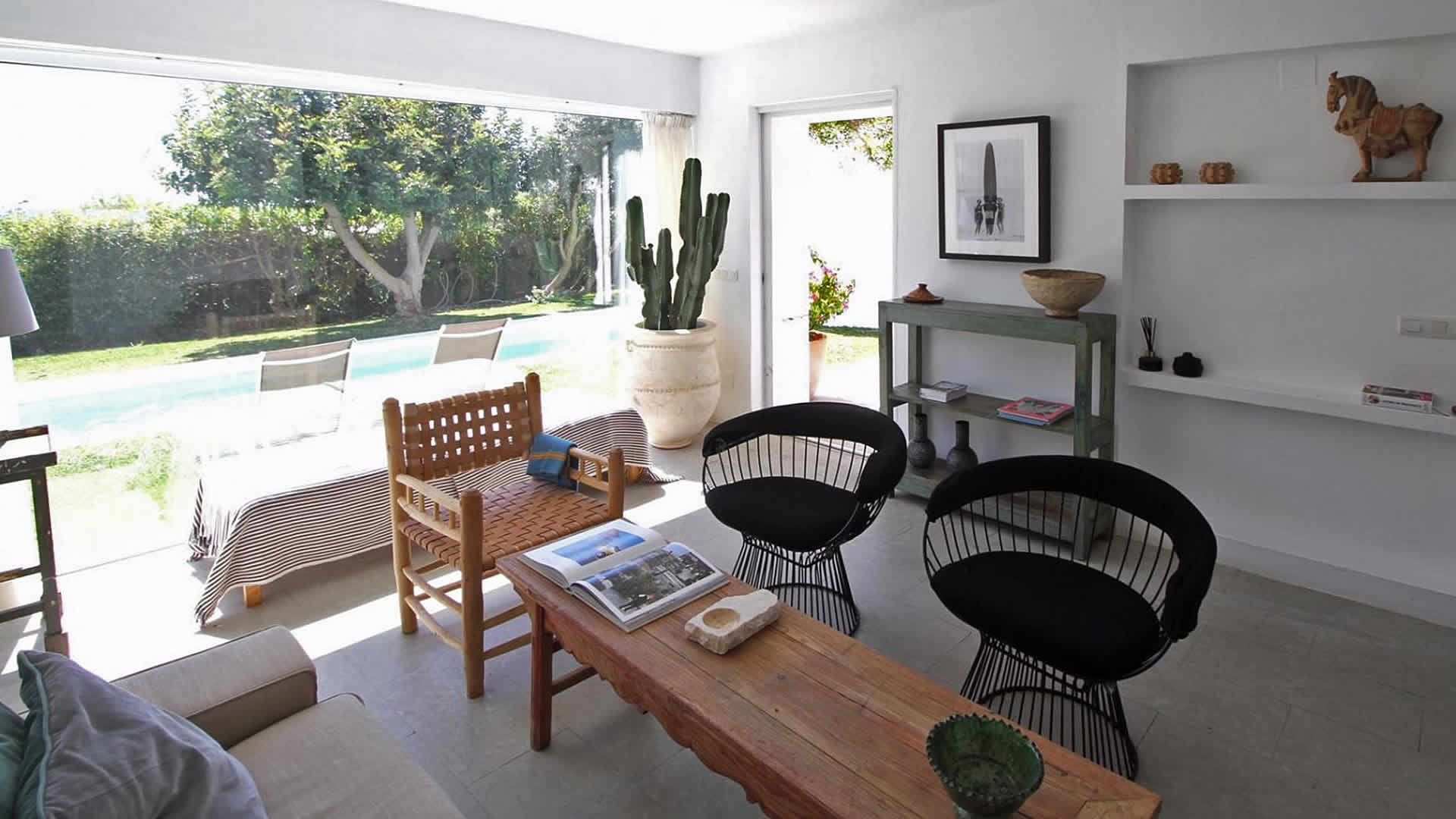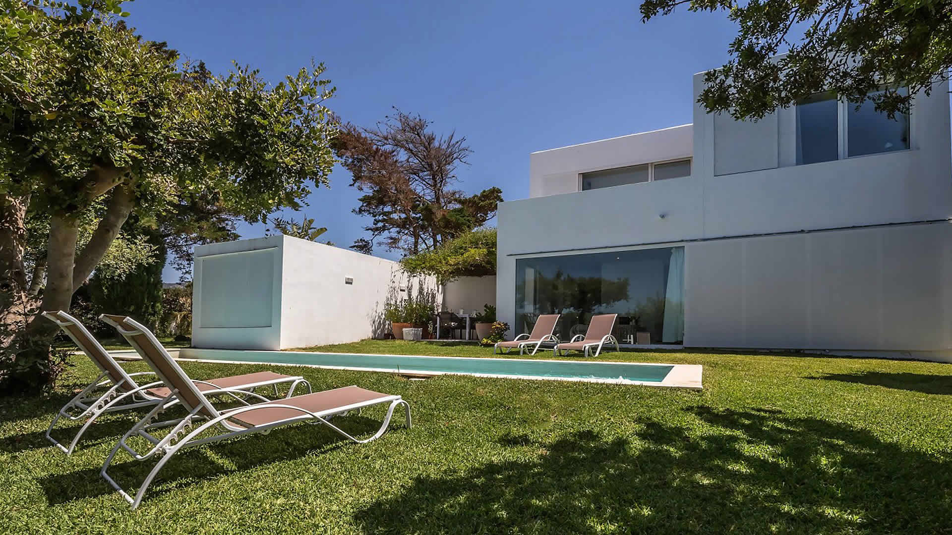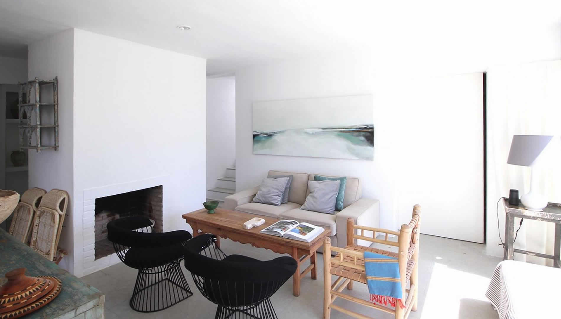 Esta imponente casa cuenta con un moderno interior en colores blancos y todo tipo de comodidades, siendo presentada en varias revistas de interiorismo. La minimalista sala de estar tiene un gran ventanal con vistas al jardÃn y una chimenea para los dÃas más frÃos de la temporada baja. Junto a la sala de estar, encontrará un relajante salón que puede convertirse en un tercer dormitorio. Ãste cuenta con un colchón de gran tamaño (3 X 2 metros aprox.), televisión de pantalla plana, DVD y equipo musical. La cocina-comedor está independiente y completamente equipada con frigorÃfico combi, microondas, lavadora y lavaplatos. La planta baja también presenta un cuarto de baño completo. En el primer piso hallará el dormitorio principal con maravillosas vistas al mar y otro dormitorio con dos camas individuales. Se completa esta planta con un cuarto de baño completo y dos terrazas con vistas.