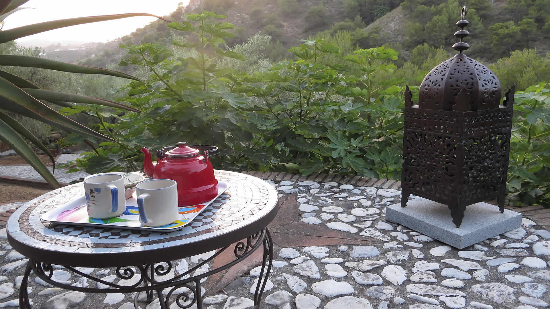 Als Damain, Eigentümer des Hauses, sich mit der Frage an uns wandte, ob wir nicht sein "cottage" promoten wollten, erzählte er uns zuerst nichts über den Namen. Stattdessen schickte er uns einige Fotos, die uns zusagten, so dass wir beschlossen, im Herbst 2009 einmal vorbei zu schauen. Damian holte uns in Frigiliana ab und wir genossen eine wunderschöne, zehnminütige Autofahrt durch die Berge. Obwohl einige scharfe Kurven genommen werden müssen, ist die Anfahrt jedoch nicht gefährlich, da der Weg vollständig befestigt ist. Bei Ankunft waren wir sehr beeindruckt von der auÃerordentlich schönen Lage des Hauses: es liegt verborgen in einem der schönsten Täler dieser Region, und grenzend an den Nationalpark Sierra Tejada. Obwohl es den Anschein hat, dass man meilenweit vom Meer entfernt ist, liegen die Strände von Nerja nur 20 Autominuten weit weg (9 Km.). Damian und seiner Frau war es ein groÃes Anliegen, respektvoll mit der umliegenden Natur umzugehen, und so sollte auch das Haus sich diskret in die vorhandene Umgebung einfügen. Das ist auf jeden Fall geglückt: Das Haus ist umstanden von Nadelbäumen, duftenden Pflanzen und jahrhundertealten Olivenbäumen. Das entzückende Tal dient als dekorativer Hintergrund für das 9 x 4 Meter groÃe eigene Schwimmbecken, das umgeben wird von einer charmanten Terrasse. Von Bäumen umgeben, strahlt das Ganze viel mediterranes Flair aus. Im Wohnzimmer öffnen sich Gartentüren zur "grün gefliesten Terrasse", einem herrlichen Ort für das Frühstück oder Abendessen, während man gleichzeitig versinkt in der fantastischen Aussicht über die Umgebung. Der farbenprächtige marokkanische Tisch in der Nähe des Hauseingangs steht für die hier herrschende entspannte Atmosphäre, und damit hängt auch nun der Name des Hauses zusammen: Darauf angesprochen, erzählt Damian uns folgendes: "Wenn Du in der Lage bist, den wahren Wert der Natur zu ermessen und sie als Geschenk und Moment des Glückes zu erfahren, dann hast Du die "Farben des Windes" gesehen".