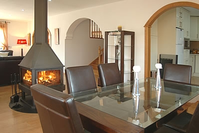 La villa dispone de 2 plantas, cada una de aprox. 100m2, y ofrece excelentes calidades, con suelo radiante de roble, habitaciones espaciosas y mobiliario muy confortable. En el centro del salón hay una preciosa estufa de leña que aporta calidez al conjunto, que tiene un diseño bastante moderno pero cálido. Hay 2 sofás, TV por satélite, DVD y equipo de música con radio y CD. La cocina está bien equipada con una placa de gas con 5 fuegos, horno, microondas, frigorÃfico/congelador y lavadora. También hay un aseo en esta planta. En la primera planta hay un dormitorio con cama de matrimonio y baño ensuite con ducha y calidades de lujo. El segundo dormitorio tiene también cama de matrimonio; el tercero, 2 camas individuales. El segundo baño es amplio y completo. Notas:- La casa tiene su propio sistema solar para generar electricidad, que funciona perfectamente, también en dÃas nublados. Aún asÃ, hay un generador (casi sin usar), por si en algún momento no hubiera suficiente energÃa.