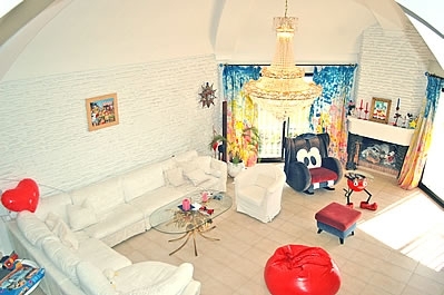 Por dentro es muy espacioso y luminoso con una decoración con mucho color que resulta un poco extravagante. El salón impresiona por su alto techo con varios arcos formando una cúpula que refuerza la sensación de amplitud. Hay una chimenea, televisión de 42 pulgadas con recepción a través de satélite, equipo de música con CD y un rincón con una barra, estupendo para entretenerse con los amigos. La cocina es de lujo, muy amplia y dispone de vitro-cerámica, horno, microondas, lavavajillas y algunos artilugios especiales como una maquina expreso. Junto a la cocina encontrará el comedor con sillas en varios colores. Los tres dormitorios están situados en la primera planta y decorados con el mismo toque de color y extravagancia. Hay 2 baños (uno de ellos ensuite) y un aseo. La lavadora se encuentra en un cuarto independiente.Nota: La casa dispone de aire acondicionado en los dormitorios (gratuito).