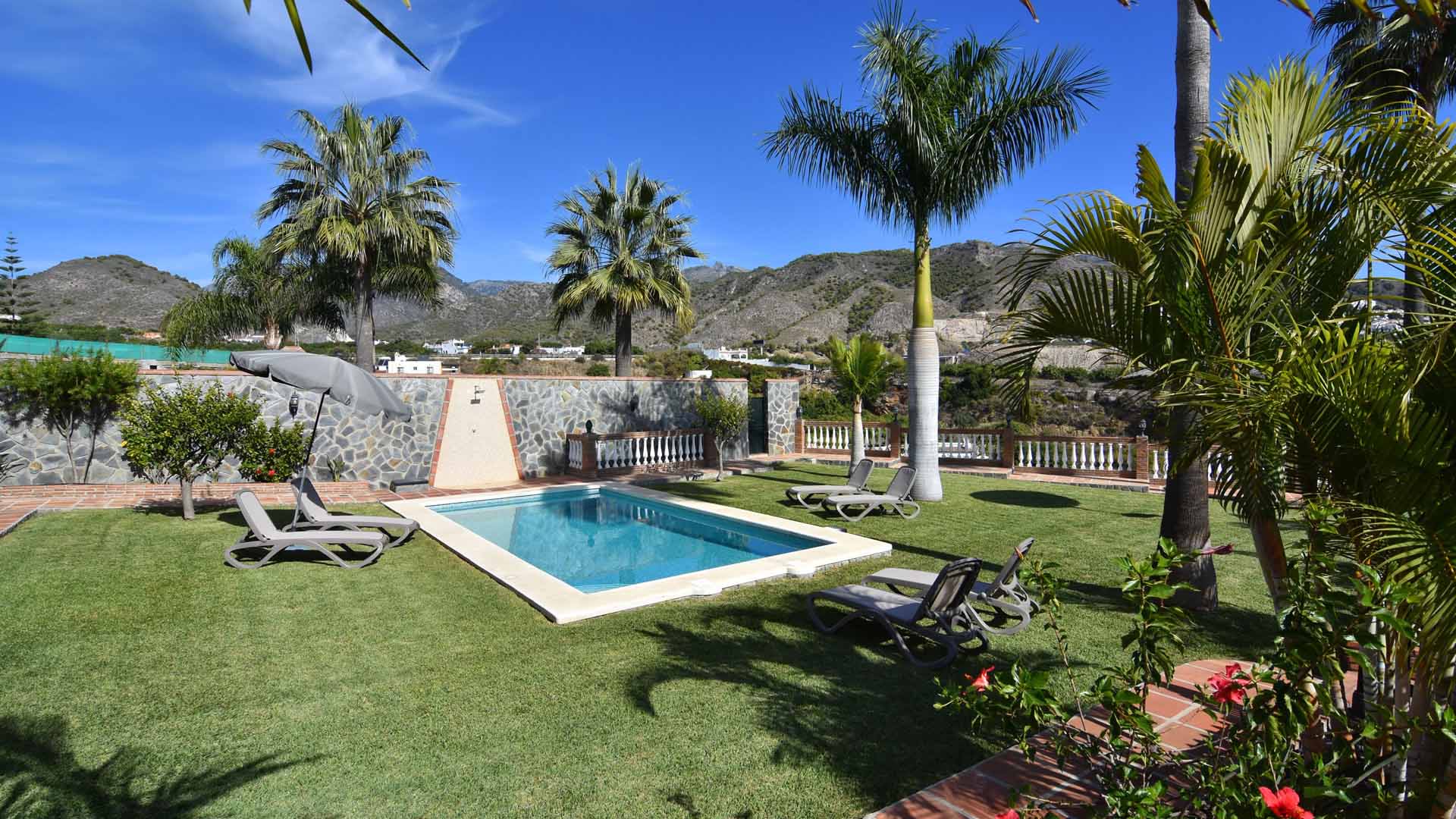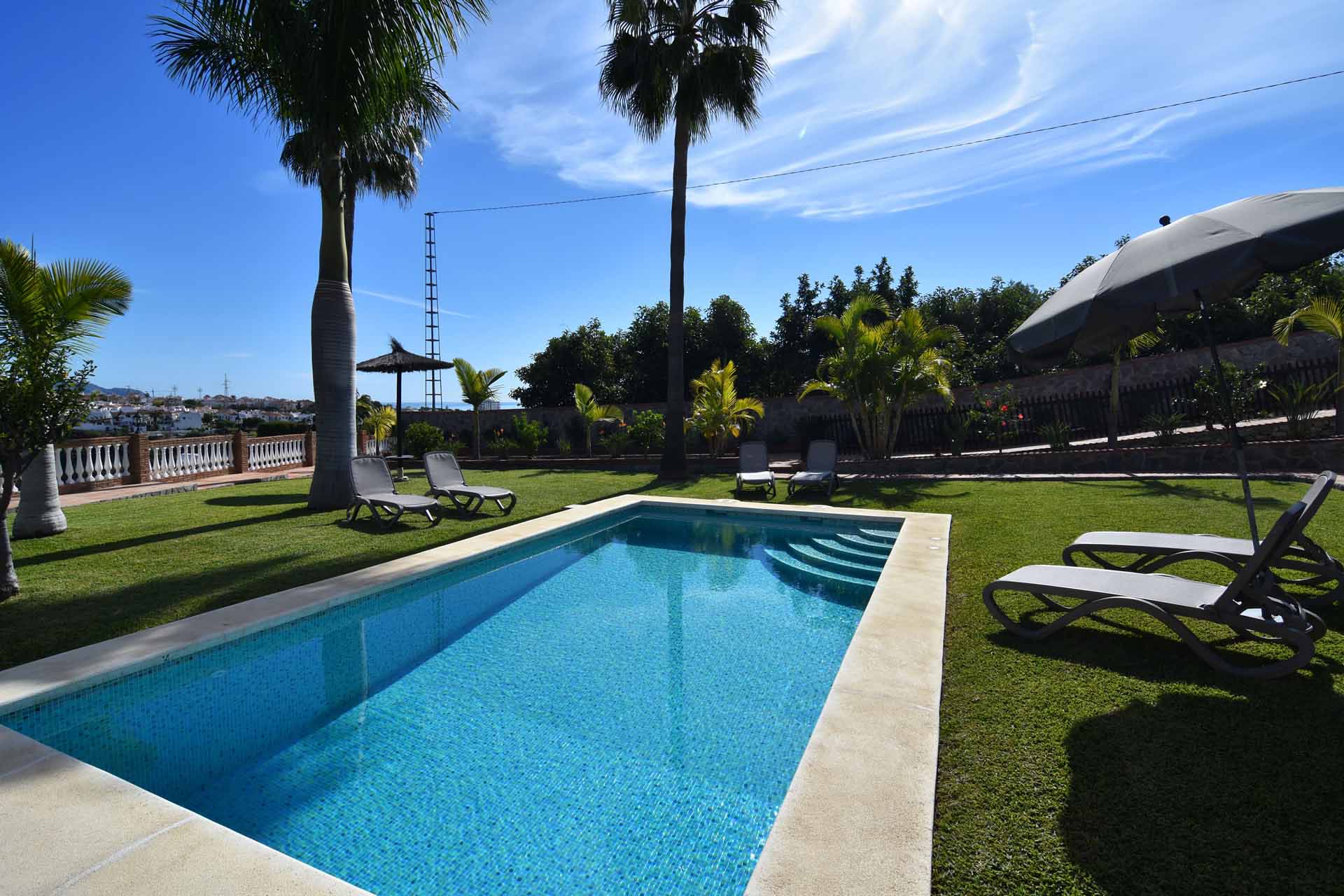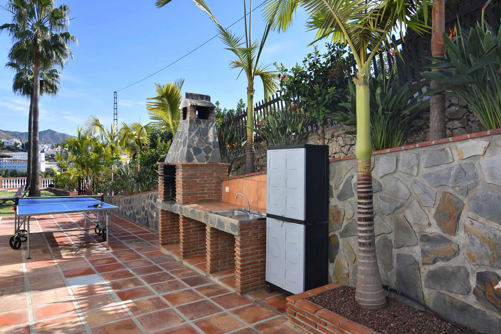 De villa is bereikbaar via een eigen weg vanaf de elektronisch bediende toegangspoort. U kunt buiten eten op het mooie, schaduwrijke terras dat aan het huis grenst, een barbecue staat voor u klaar! Zonaanbidders zullen gecharmeerd zijn van het gazon dat het verleidelijke privé zwembad van 8 x 4 meter omringt, compleet met ligstoelen. Vanaf hier hebt u een schitterend uitzicht, óver de toppen van de avocadobomen, over het landschap en de heuvels die Nerja omringen. De villa ligt slechts 5 minuten rijden van Nerja (3 kilometer) en het Burriana strand is nog dichterbij (2,2, kilometer). Historisch Granada, met zijn spectaculaire Alhambra paleis, het Middeleeuwse AlbaicÃn district, winkels, zijn mooie pleinen en paleizen is een bezoek meer dan waard, iets meer dan een uur rijden. De omgeving van het huis is een paradijs voor wandelaars; in de plaatselijke boekwinkels kunt u het boekje "Twelve walks around Nerja", geschreven door Elma en Denis Thompson, kopen. Enkele andere excursies die u kunt maken zijn de schilderachtige "witte" dorpen van de Axarquia en de historische Nerja grotten.