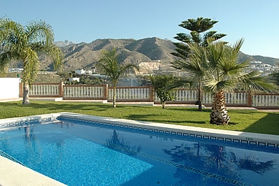 Se accede a la propiedad a través de una entrada privada que baja desde la valla automático con mando a distancia. Para las comidas en el exterior encontrará un sombreado porche - hay barbacoa. Los amantes del sol estarán encantados con la amplia zona de césped que rodea la piscina (8x4m). Hay 6 hamacas para que todo el mundo puede broncearse cómodamente. Tanto desde el porche como desde el jardÃn disfrutará de estupendas vistas panorámicas sobre campos de aguacates, con la Sierra de Almijara en el norte y Nerja al sur y el mar al fondo. La casa se encuentra a tan sólo 5 minutos en coche (2 kms) de Nerja y de playa Burriana (2,2 kms).