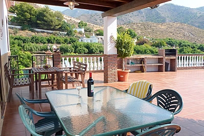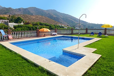 Situada a tan sólo 3 kms al norte de Nerja, en las montañas donde reinan la paz y tranquilidad. La zona exterior invita a relajarse con un buen libro o a tomar el sol en sus jardÃn con césped, amplia terraza, muy completa con barbacoa, hamacas, mesa comedor y sillas. La tentativa piscina privada mide 8 x 5 metros, suficiente para darse un buen chapuzón. Desde aquà es muy fácil emprender una excursión a los pueblos de la AxarquÃa, como por ejemplo Cómpeta, famoso por su miel y dulces vinos. Málaga capital esta a una hora de distancia y vale la pena visitar el museo Picasso para quienes aún no lo han visto. ¡Y no olvide las cuevas de Nerja!