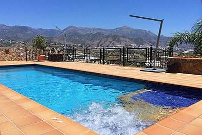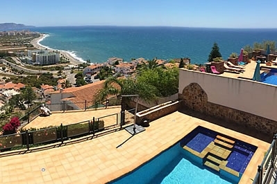 Esta villa de lujo se organiza en 4 plantas, todas con vistas al mar. En la planta baja superior (a nivel de calle), donde se encuentran el salón y la cocina, una espléndida terraza con mobiliario de jardÃn le espera, el sitio ideal para un desayuno soleado! Una escalera conduce a las habitaciones en una planta inferior, cada una de ellas con su propia salida a la terraza. Nueve escalones más abajo conducen a la planta sótano, donde hay también una estupenda terraza que rodea la piscina privada (9x4 m), con chorros de hidromasaje en un rincón. Se proporcionan tumbonas y sombrillas. La planta más baja (a nivel de jardÃn) consiste en un pequeño jardÃn con césped y una zona de barbacoa con una cocina de verano con nevera/congelador, encimera y fregadero. Dispone de muebles de jardÃn.La villa goza de una ubicación privilegiada, con orientación sur-este y vistas a la zona residencial de Punta Lara. La playa y los restaurantes de Punta Lara están a unos 600 metros, mientras que Nerja se encuentra a 5 minutos en coche. Dispone de dos plazas de aparcamiento en frente. Debido a la empinada subida hasta la casa, es indispensable tener coche, y el número de escaleras en el interior y en el jardÃn la hacen inadecuada para personas con dificultades para caminar.