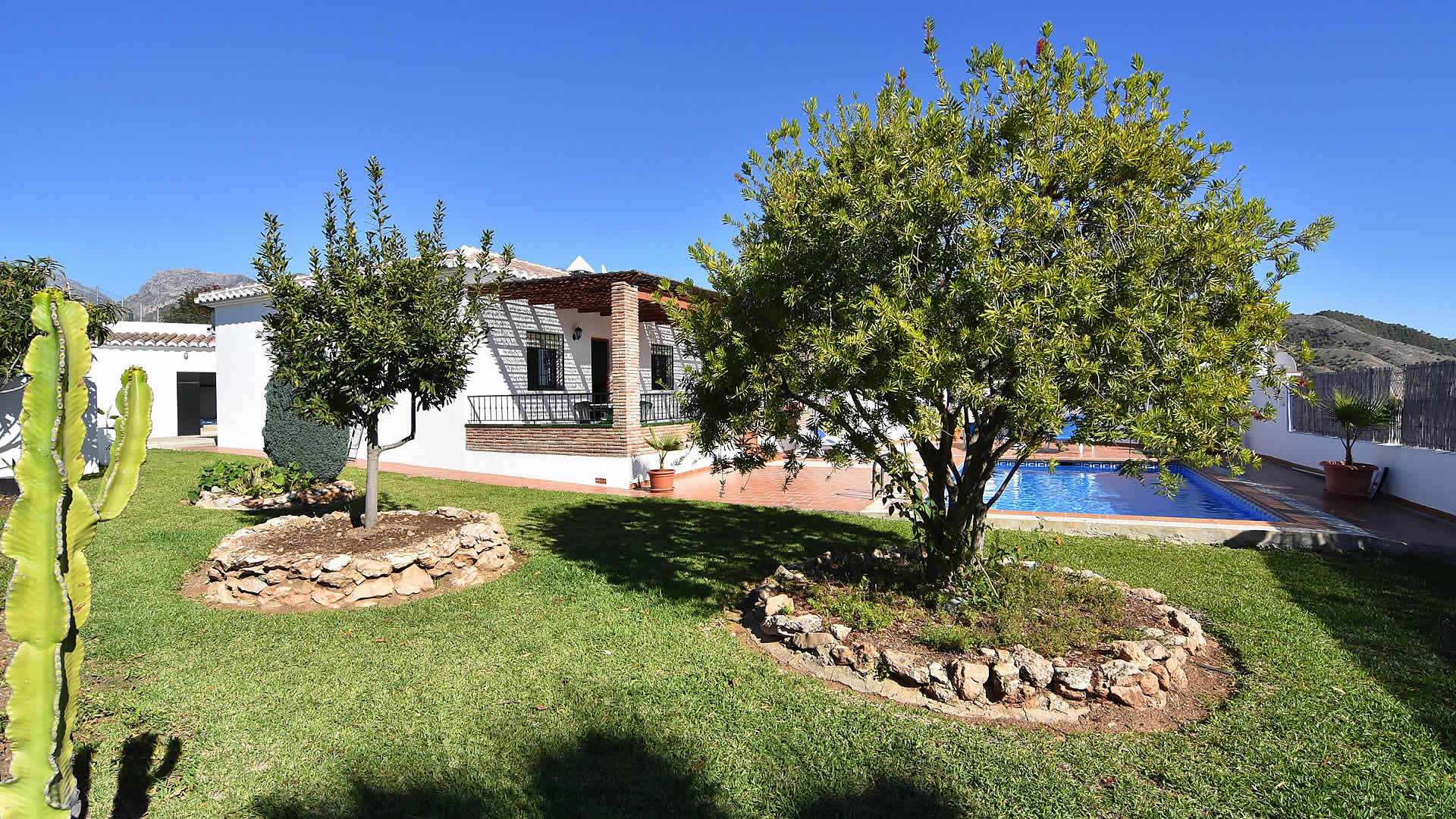 Ãsta es la casa ideal para vivir al aire libre; puede refrescarse en su propia piscina privada (7m x 3m de largo y 1,35m â 1,63m de profundidad), disfrutar de una siesta bajo la sombra del porche o usar la barbacoa para sus cenas al aire libre. ¡Parecerá que los dÃas soleados nunca llegan a su fin! La finca tiene un emplazamiento tranquilo en el campo pero de fácil acceso. Los niños disfrutarán del jardÃn de césped donde pueden jugar sin perderse. Se proporcionan muebles de jardÃn y tumbonas. Si puede alejarse de este relajante lugar, visite los hermosos pueblos de los alrededores o experimente la grandeza del espléndido Palacio de la Alhambra de Granada. Para salir de noche, Nerja ofrece una excelente selección de restaurantes, bares de tapas y locales para ir de fiesta. Nerja es también el lugar donde los amantes de la playa tienen una amplia para escoger, desde la famosa playa de Burriana a las playas más aisladas al este.