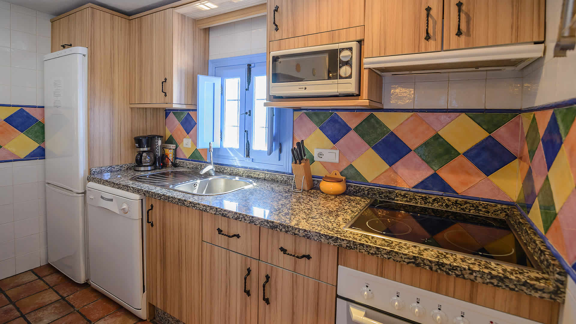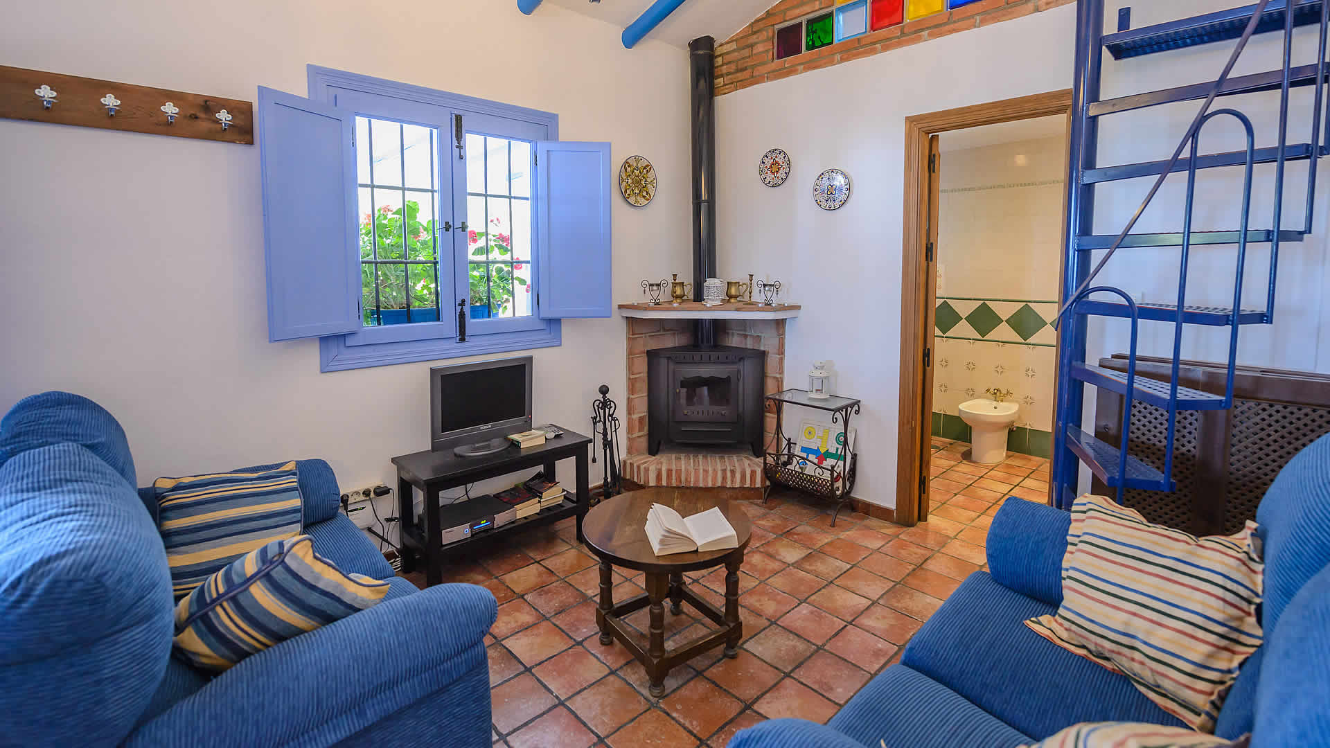 El salón es muy confortable y tiene acceso directo al porche. No es muy grande, pero es amueblado con inteligencia. Hay una mesa comedor, 2 sofás, chimenea y tv por satélite. La cocina esta equipada con vitro-cerámica, horno, lavadora, microondas, lavavajillas y frigorÃfico. En esta planta encontrará 2 dormitorios (uno con cama de 150 cm y otro con 2 camas individuales) y un baño completo. Un tercer dormitorio con cama de 135 cm y baño propio con ducha se encuentra en un apartamento independiente la planta inferior. Internet WiFi disponible (gratuito).Nota: Dispone de aire acondicionado en los dormitorios; es opcional, el coste varÃa en función del uso (a pagar allà a la salida).