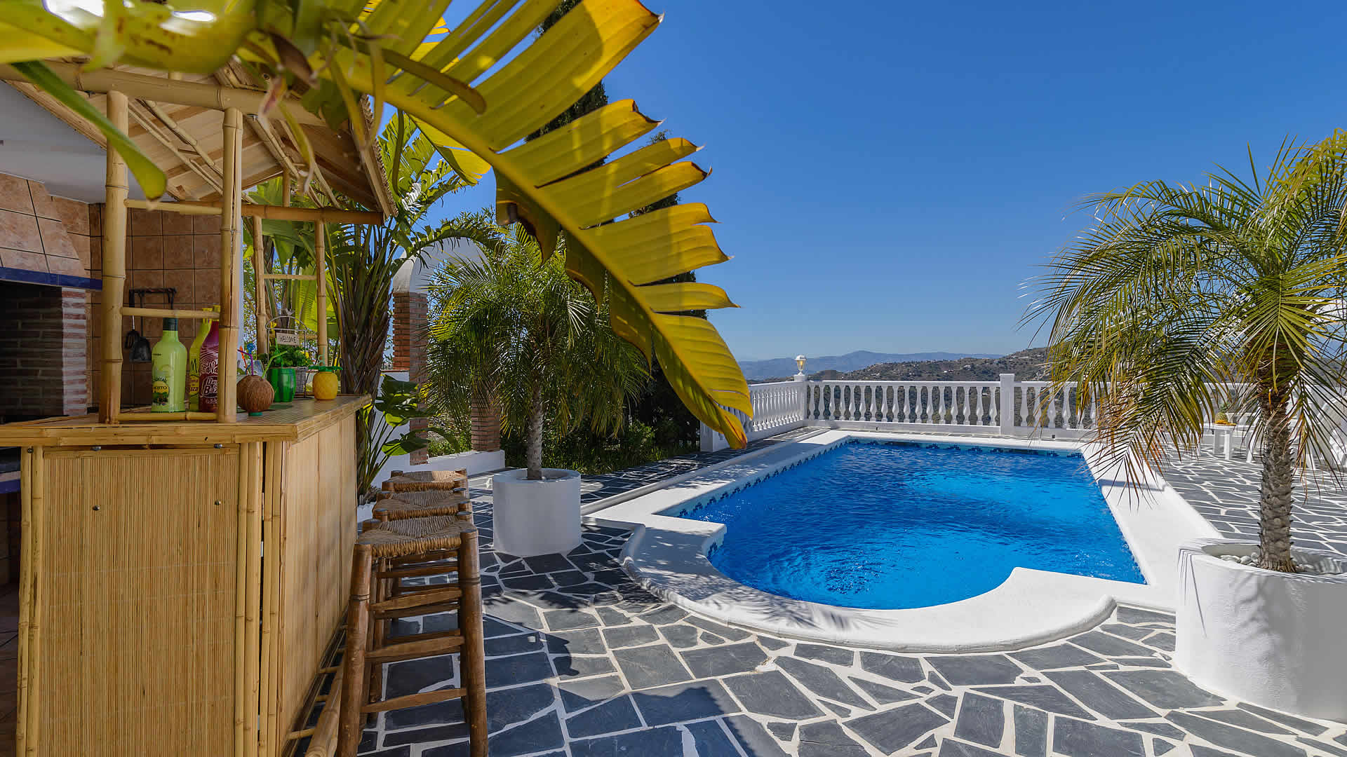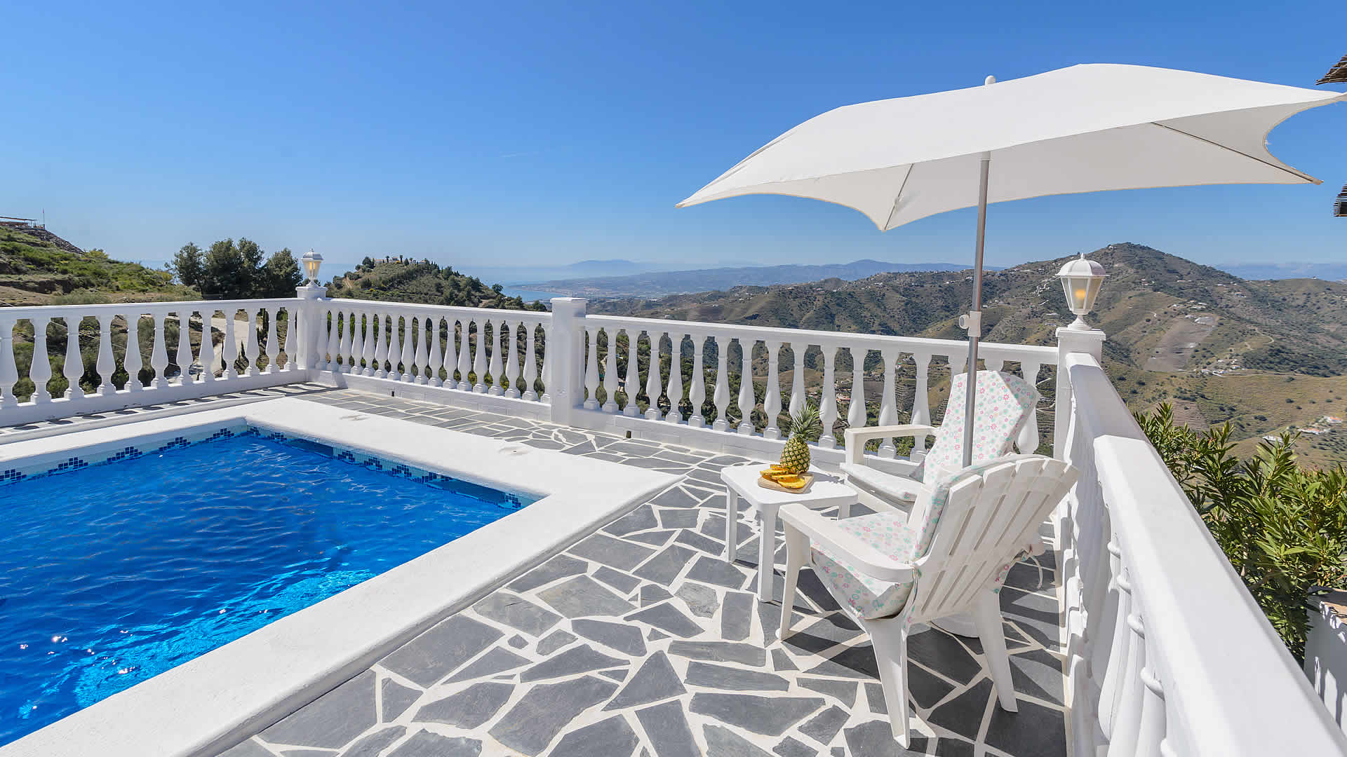Outside, a covered terrace overlooks your private pool (8x4m) - imagine the magnificent views while dining alfresco at your verandah! At the sun terrace you will find patio furniture, sun loungers and a built-in barbecue. The location of the villa is rural, yet only fifteen minutes drive from the beaches of Torrox Costa (10 km). The villa is accessed by a 1,5 km concreted track and located at 6,5 km from Torrox and 9 km from Cómpeta, a typical white village famous for its' sweet Moscatel wine. It's worth to make a trip into the mountains to see more of these hillside villages of the Axarquia or travel along the coast road towards Almería enjoying splendid views from beautiful coves with hidden beaches.