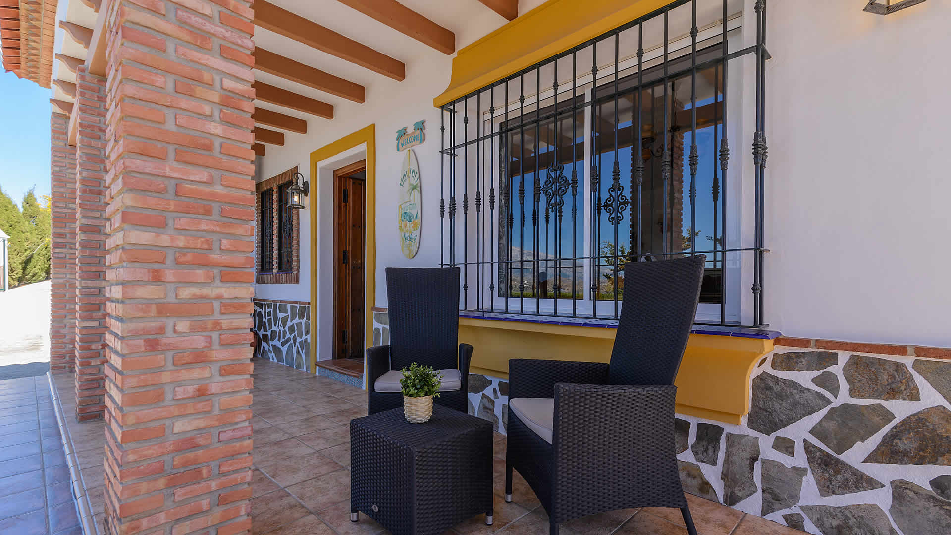 With all rooms all rooms set on the ground floor, this is a very well furnished villa. The spacious living/dining room is decorated with good taste in Andalucian country style and comes with an open fireplace, satellite TV and DVD player. The kitchen is very well equipped with a ceramic hob, dishwasher, microwave, oven, fridge/freezer and a washing machine. The bedrooms consist of three twins and a double bedroom. There is a full bathroom and a shower room with wc and wash basin. A WiFi internet connection is available (free of charge).