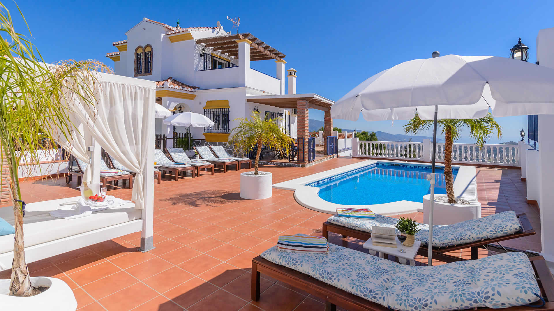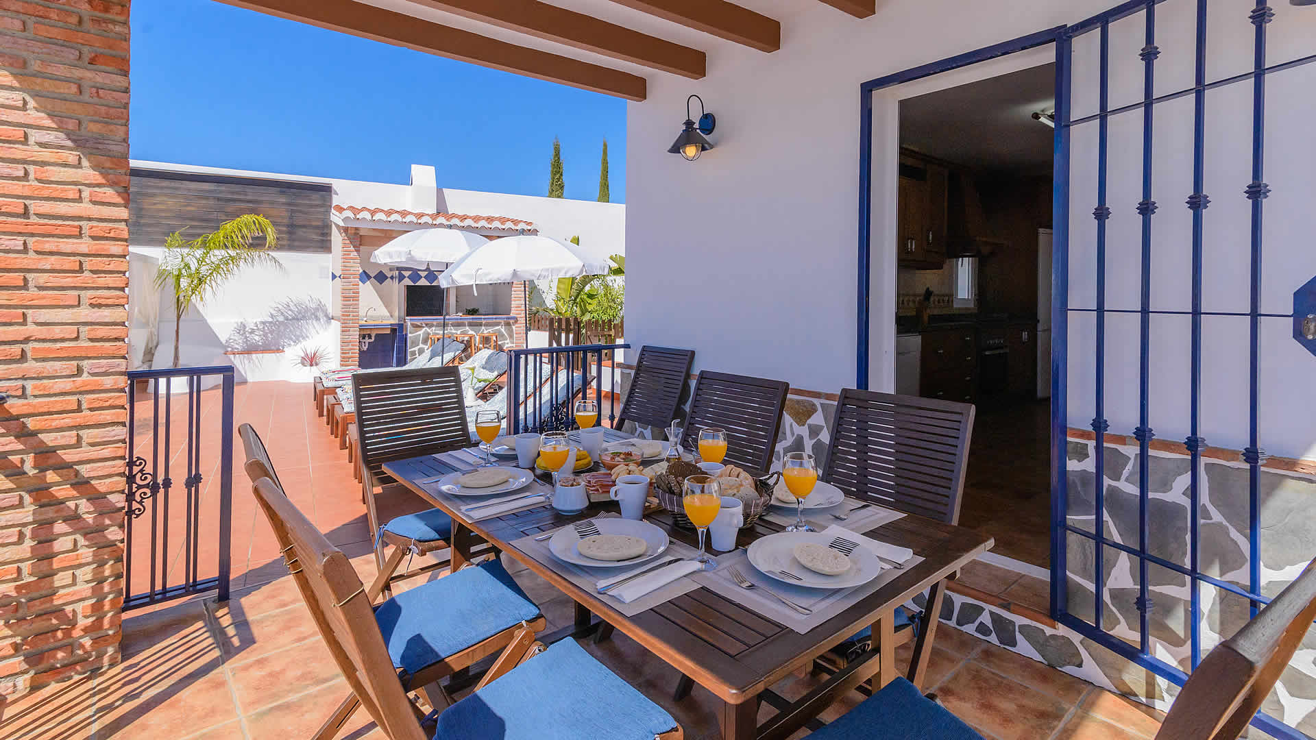 Su majestuosa situación, en una zona muy tranquila rodeada de almendros, facilitará que se sentirá en un lugar privilegiado, disfrutando de maravillosas vistas al pueblo, al mar y como telón de fondo las frondosas sierras de Almijara y Tejeda. A las playas de Torrox Costa (8 km) se llega en 15 minutos en coche, mientras las tiendas, restaurantes y bares de Torrox Pueblo (6,5 km) están aun más cerca. Es ideal para pasar un verano con la familia o amigos. Disfrutará de las comidas en la estupenda zona exterior con amplias terrazas: a la primera se accede desde el salón comedor y a la otra se encuentra junto a la piscina. La tercera terraza esta situada junto al dormitorio principal. La piscina de 7x3,5 metros, es ideal para tomar el sol (hay hamacas). Cada terraza disfruta de unas excelentes vistas y los amantes de la parilla tendrán una barbacoa a su disposición.